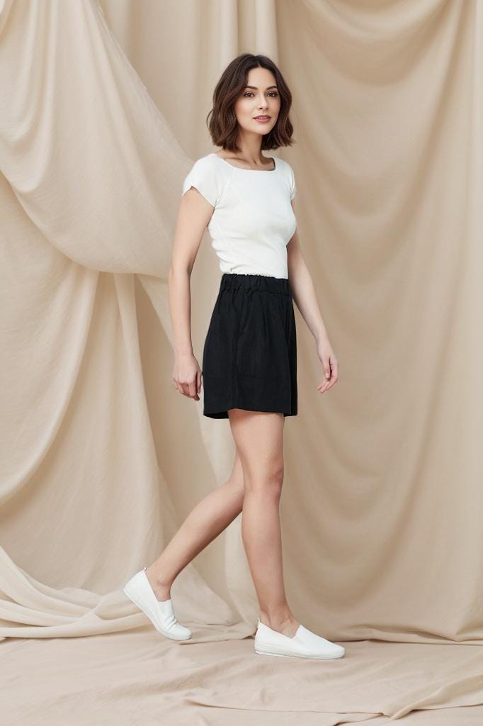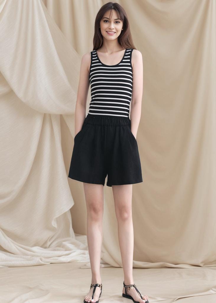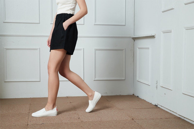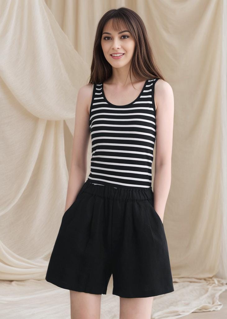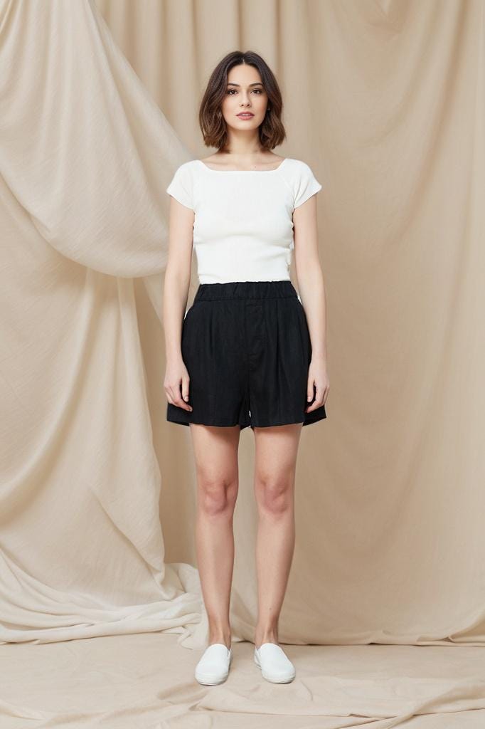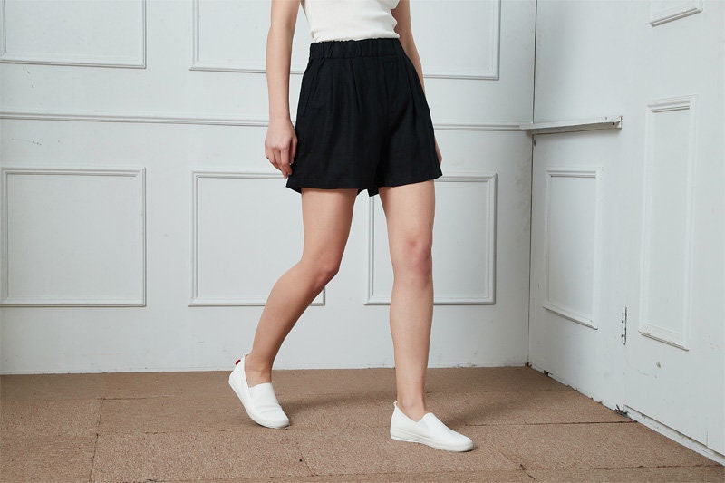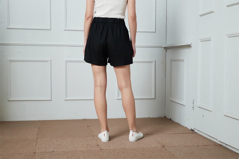 High Waist Black Linen Shorts: Elastic Waist, Pockets, Plus size, Beachwear, Ylistyle C4791