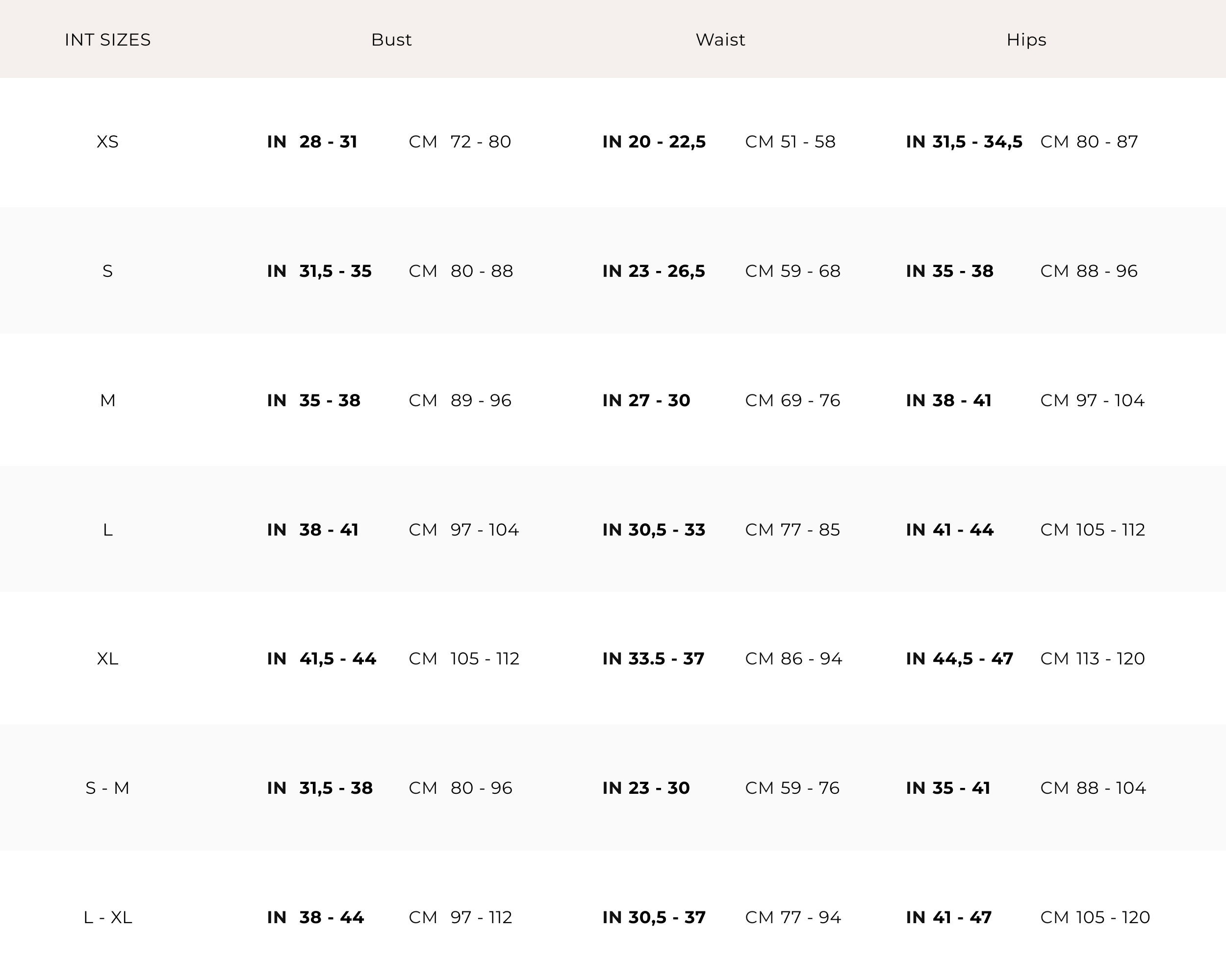 | Size | XS US women's letter, S US women's letter, M US women's letter, L US women's letter, XL US women's letter |