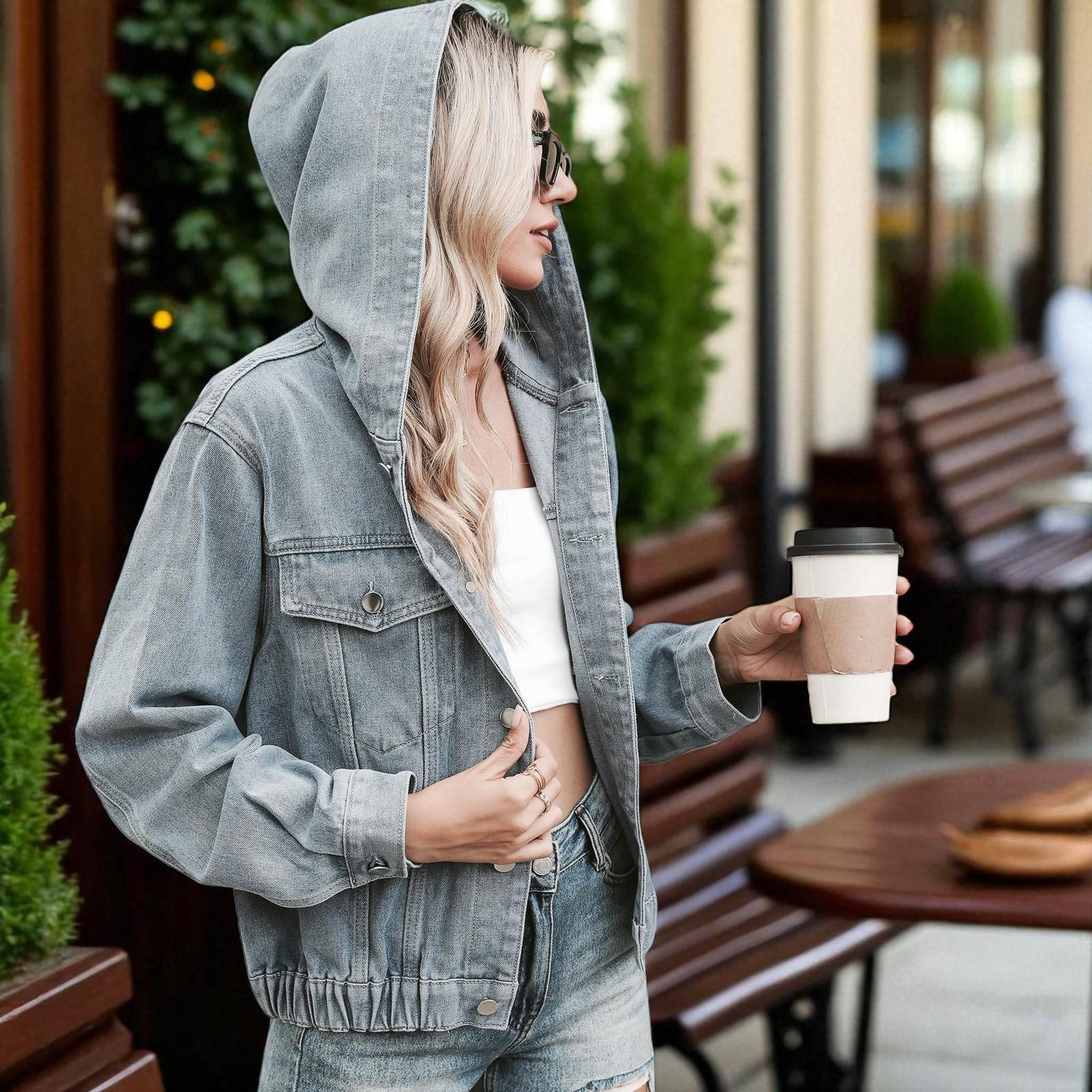 This women’s hooded denim jacket is a versatile staple for transitional wardrobes, blending casual comfort with effortless style. Made from premium washed denim, it offers a soft, breathable fit that works for mild to cool temperatures. The adjustable hood, patch pockets, and oversized silhouette make it suitable for both daily wear and trendy layered looks. Pair it with your favorite bottoms and accessories to craft a chic, laid-back outfit — stay comfortable and fashion-forward through spring and autumn.