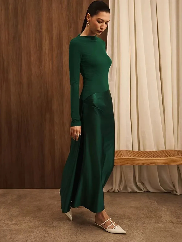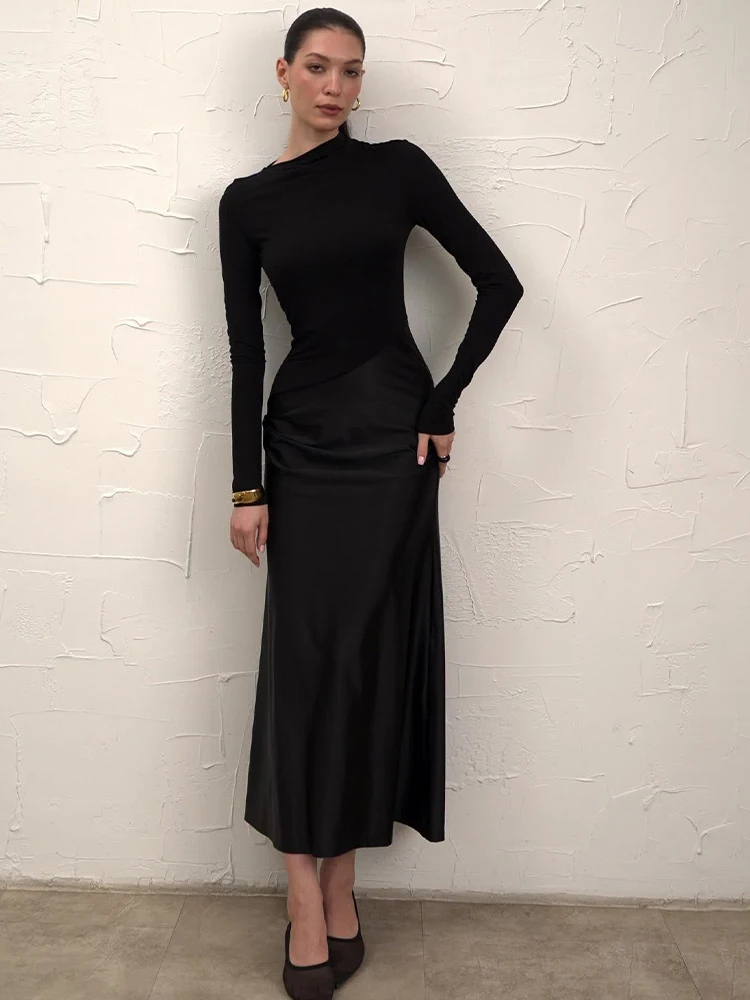 Patchwork Satin Long Sleeve Women Maxi Dress Black Round Neck High Waist Dress Winter New Elegant Party Evening Dress