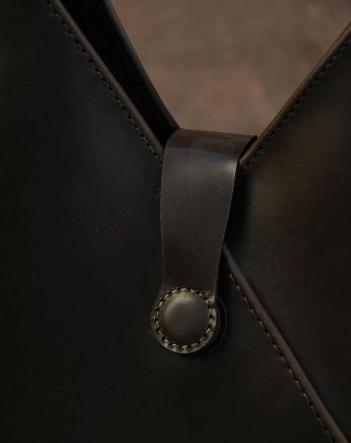 The subtle leather strap closure adds a polished, artisanal detail while keeping your items secure. Its low-profile design maintains the bag’s clean lines, ensuring style doesn’t compromise functionality for daily use.