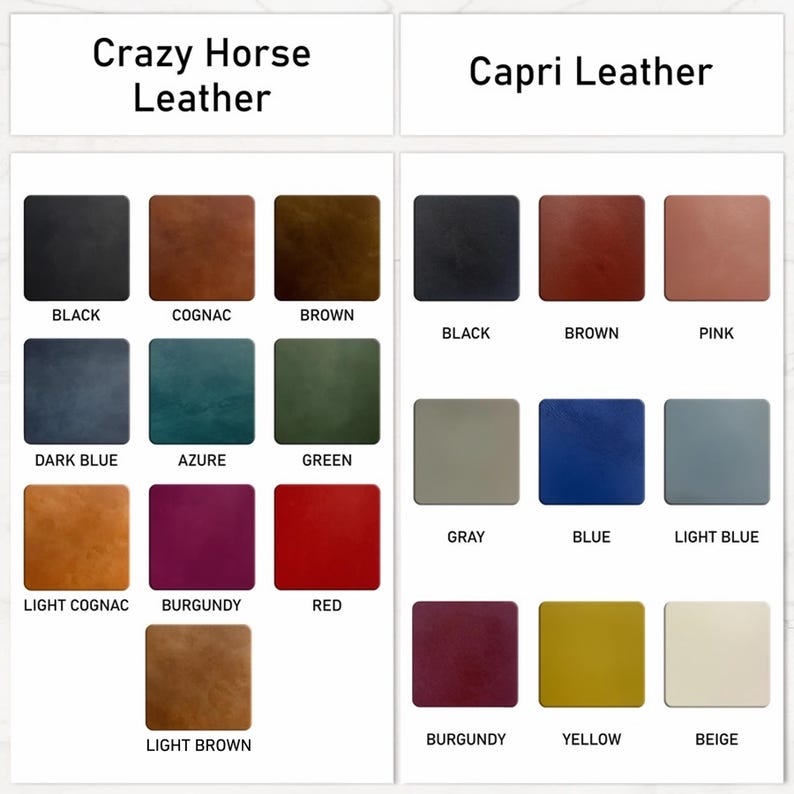 | Leathertype/Color | Crazy Horse / Black, Crazy Horse / Cognac, Crazy Horse / Brown, Crazy Horse / D Blue, Crazy Horse / Azure, Crazy Horse / Green, Crazy Horse / Red, Cr. Horse / L.Cognac, Cr. Horse /L. Brown, Capri / Black, Capri / Brown, Capri / Pink, Capri / Gray, Capri / Blue, Capri / L Blue, Capri / Burgundy, Capri / Yellow |