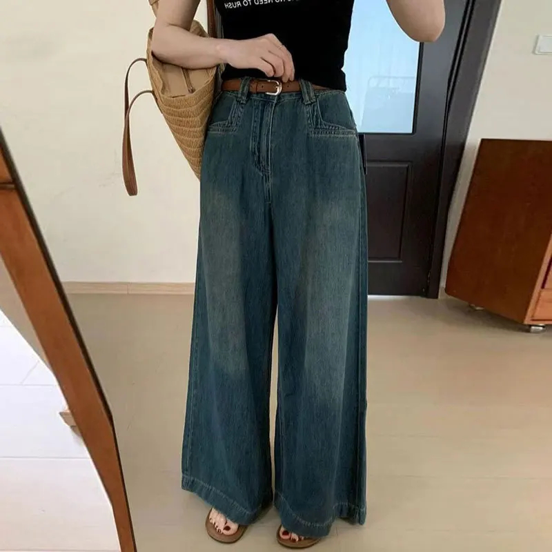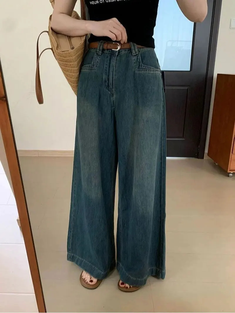 Harajuku Streetwear Retro Fashion Autumn Women High Waist Jeans Loose Wide Leg Straight Loose Denim Trousers Y2K Baggy Pants