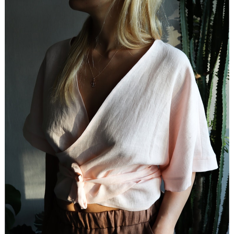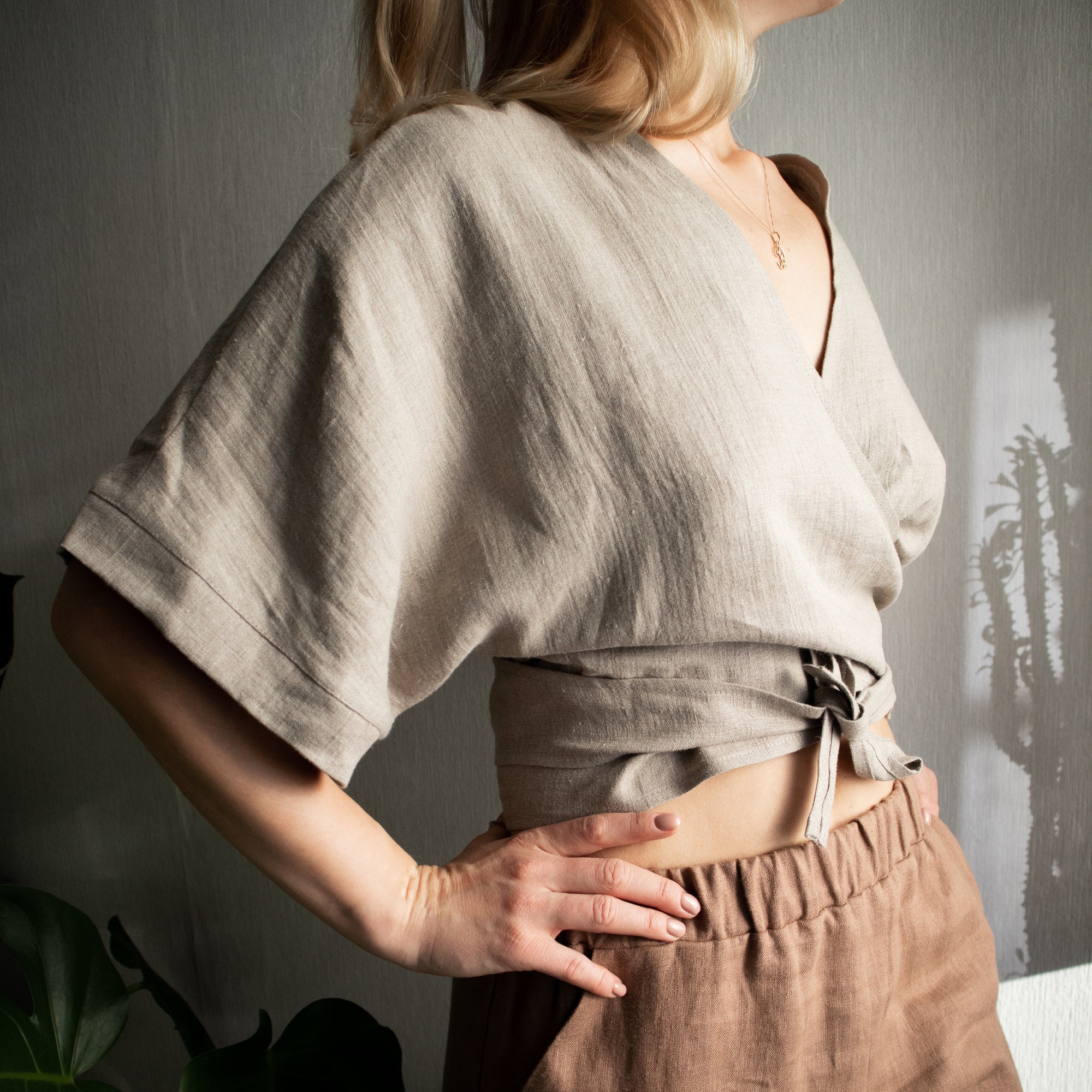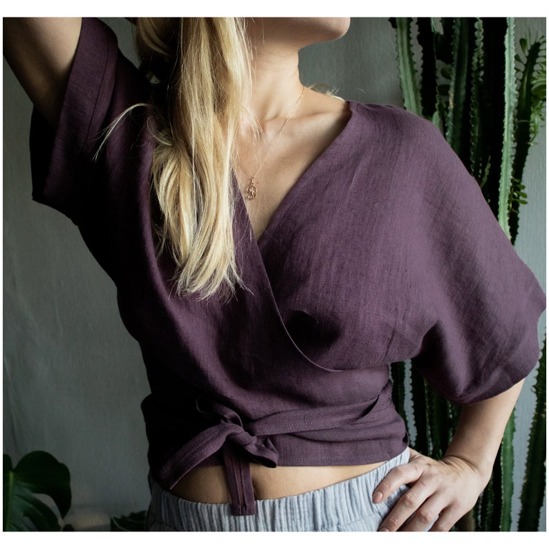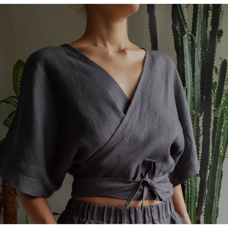 Linen top. Linen wrap top. Linen wrap blouse. Linen kimono top. Linen blouse. Linen wrap crop top. Wrapped top. Wrapped blouse. Linen wear.