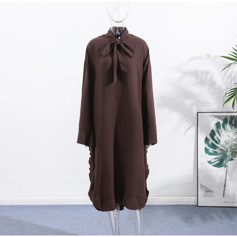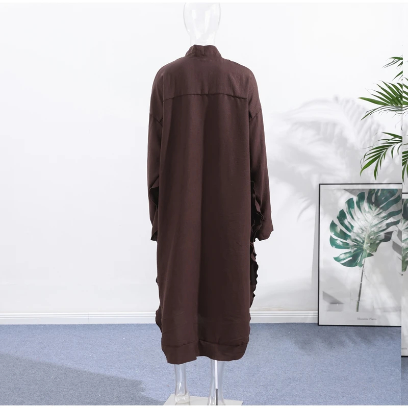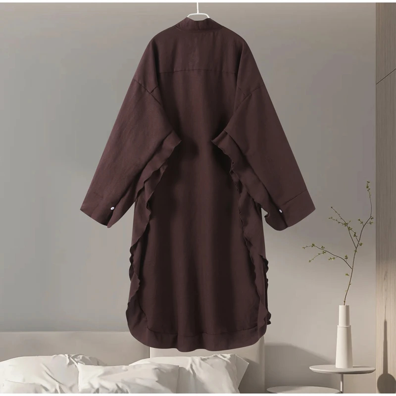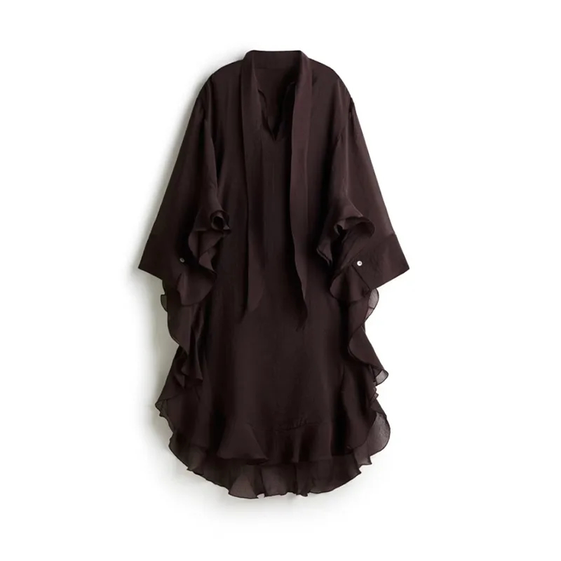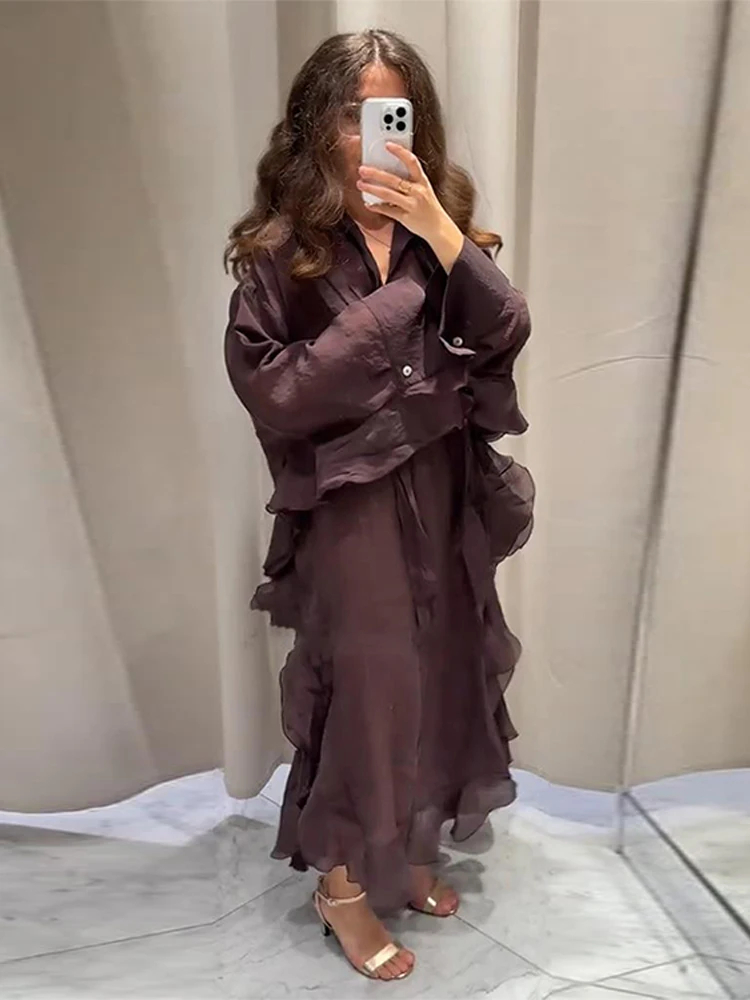 Chic Ruffled Accents: Featuring playful ruffled details on the sleeves and hem, this dress adds a trendy, feminine touch to your look. The layered ruffles create subtle movement and visual interest, elevating the design with a whimsical, modern flair.