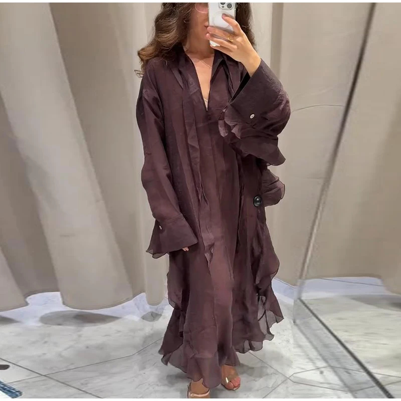 Description: This ruffled oversized maxi dress is a versatile staple for your wardrobe. Made of soft, sheer fabric, it combines comfort with playful design—featuring flowing ruffles and a relaxed fit that suits everyday wear. Suitable for brunches, errands, or casual gatherings, it transitions effortlessly between styles with simple accessory swaps. Stay comfortable and fashionable in this airy piece that balances laid-back charm with contemporary style.