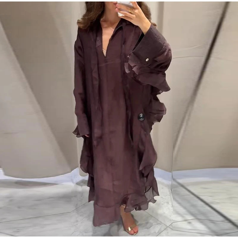 Loose V-neck Lace Up Ruffles Long Dress Women Elegant Batwing Sleeve Buttons Party Dresses 2025 Autumn Summer Lady Holiday Robes