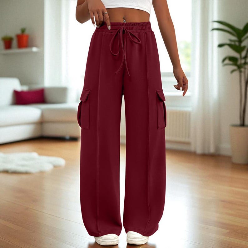 This pair of women’s wide-leg cargo pants is a versatile staple for your wardrobe. Made of soft, breathable polyester fiber, it offers all-day comfort with a relaxed, on-trend design. The adjustable drawstring waist ensures a personalized fit, while the cargo pockets add stylish functionality. The wide-leg silhouette flatters your shape, making it suitable for daily wear, lounging, or casual outings. Pair it with tops of various styles and accessorize to create a chic look that fits any laid-back occasion. Stay comfortable and fashionable with this trendy pant style.Mid-Waist Loose Jogging Pants, Comfortable Straight Leg Trousers image 5