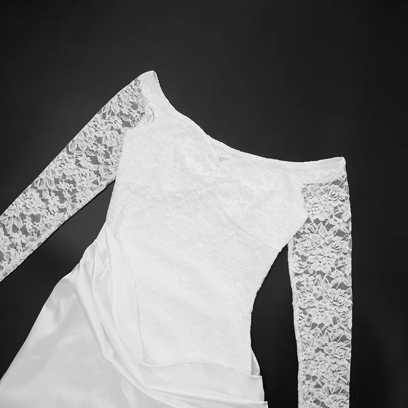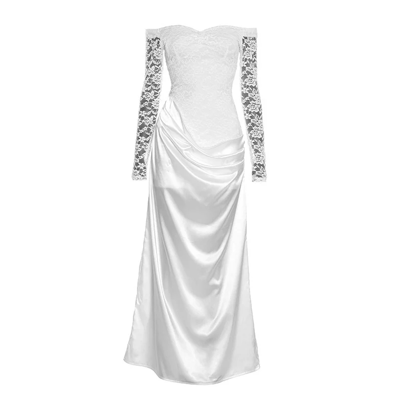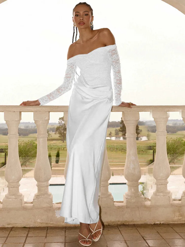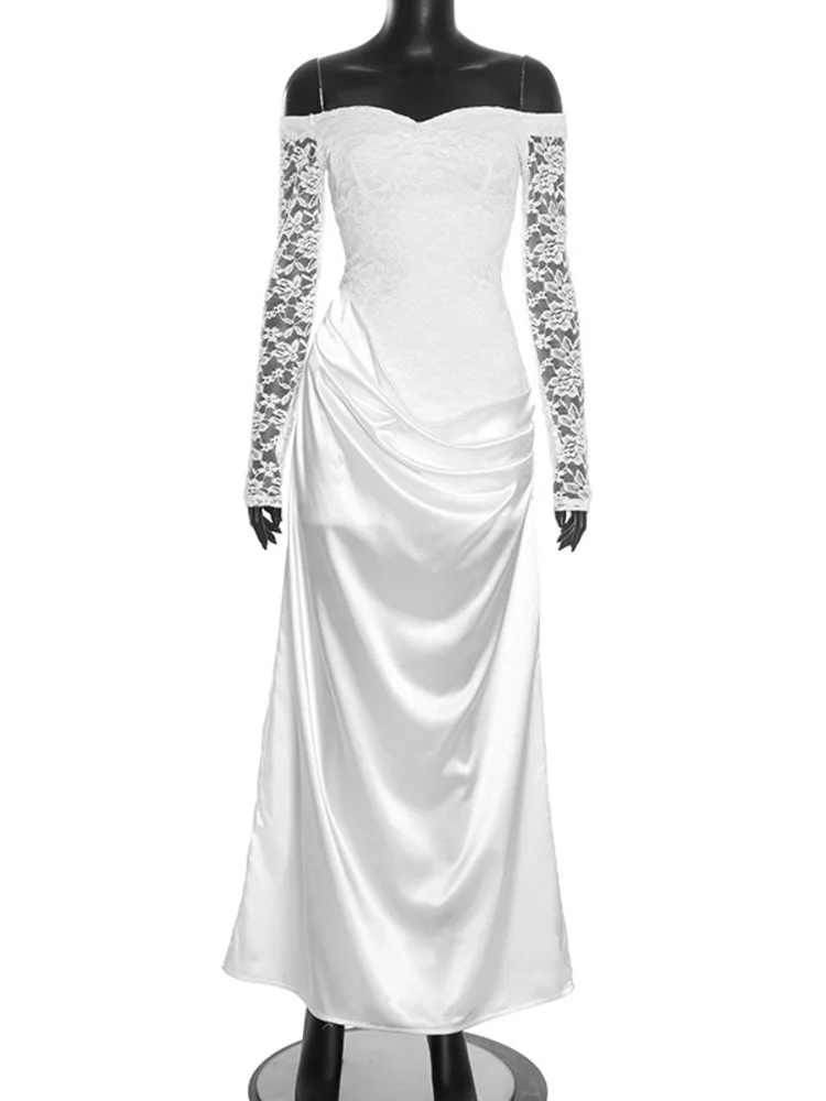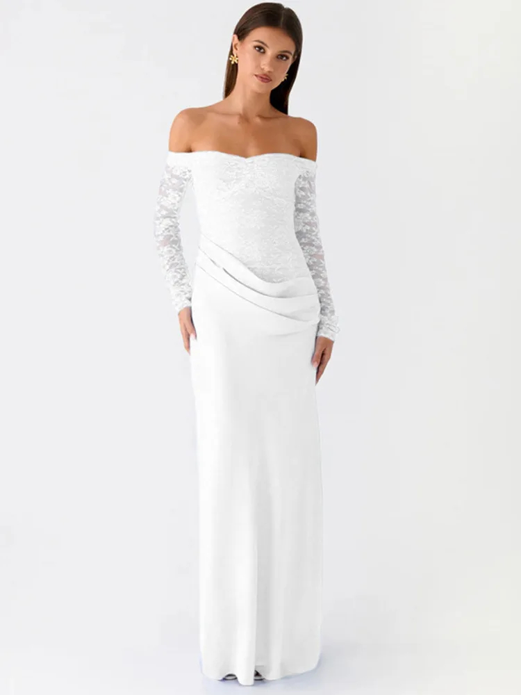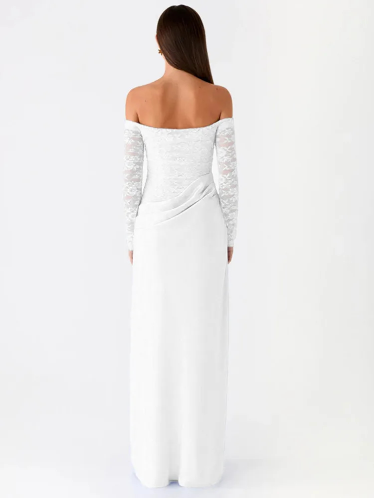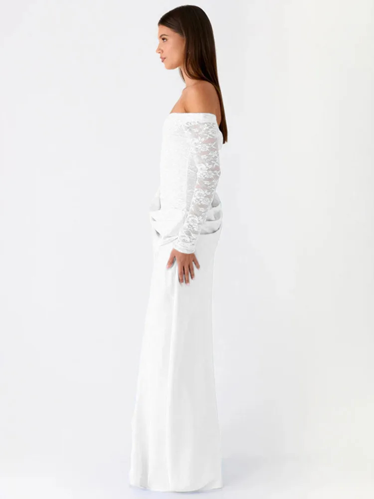 Mozision Off-shoulder Long Sleeve Sexy Maxi Dress Women Gown Elegant Lace Strapless Backless High Waist Ruched Club Party Dress