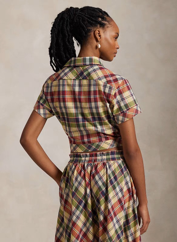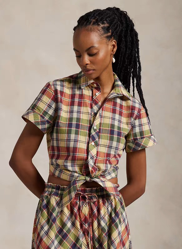 Its versatility shines through in various styling options. Pair it with the coordinating plaid pants for a head-to-toe retro ensemble, or tuck it into high-waisted denim shorts for a casual, summery look. It can also be layered over a tank top or worn open as a lightweight outer piece. Whether you’re heading to a music festival or a weekend brunch, this shirt’s tie-front design and colorful plaid ensure you stand out with effortless style, proving it’s a versatile staple for any fashion-forward individual.