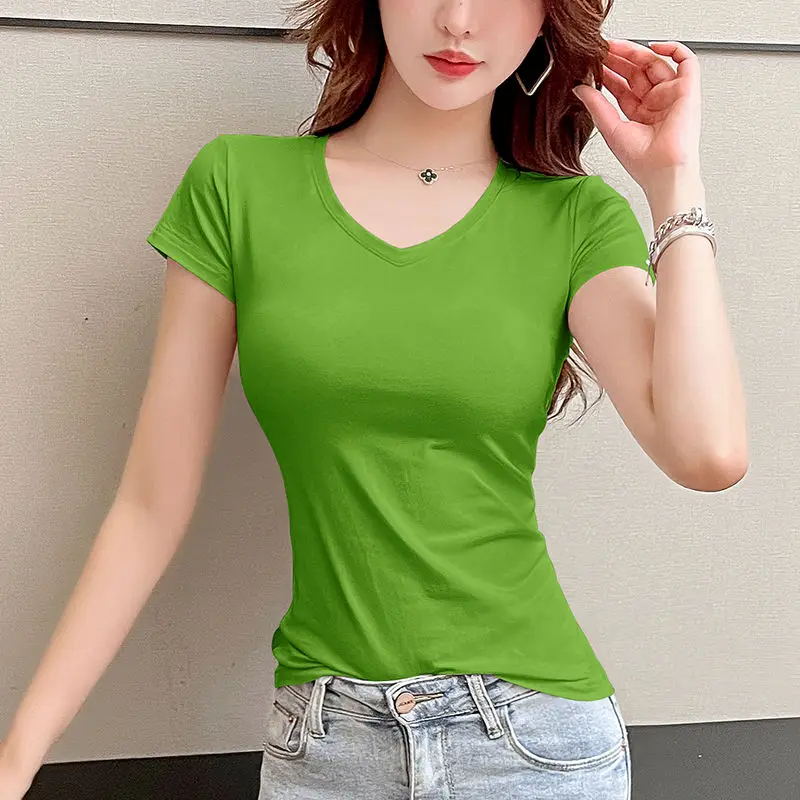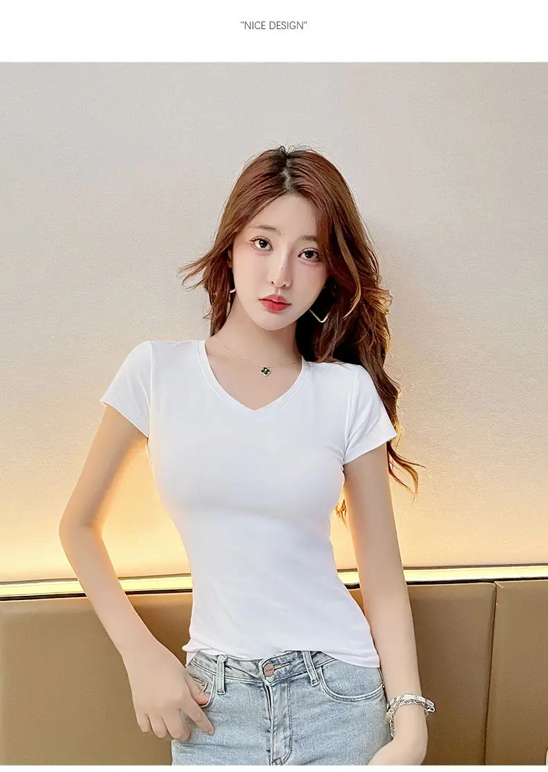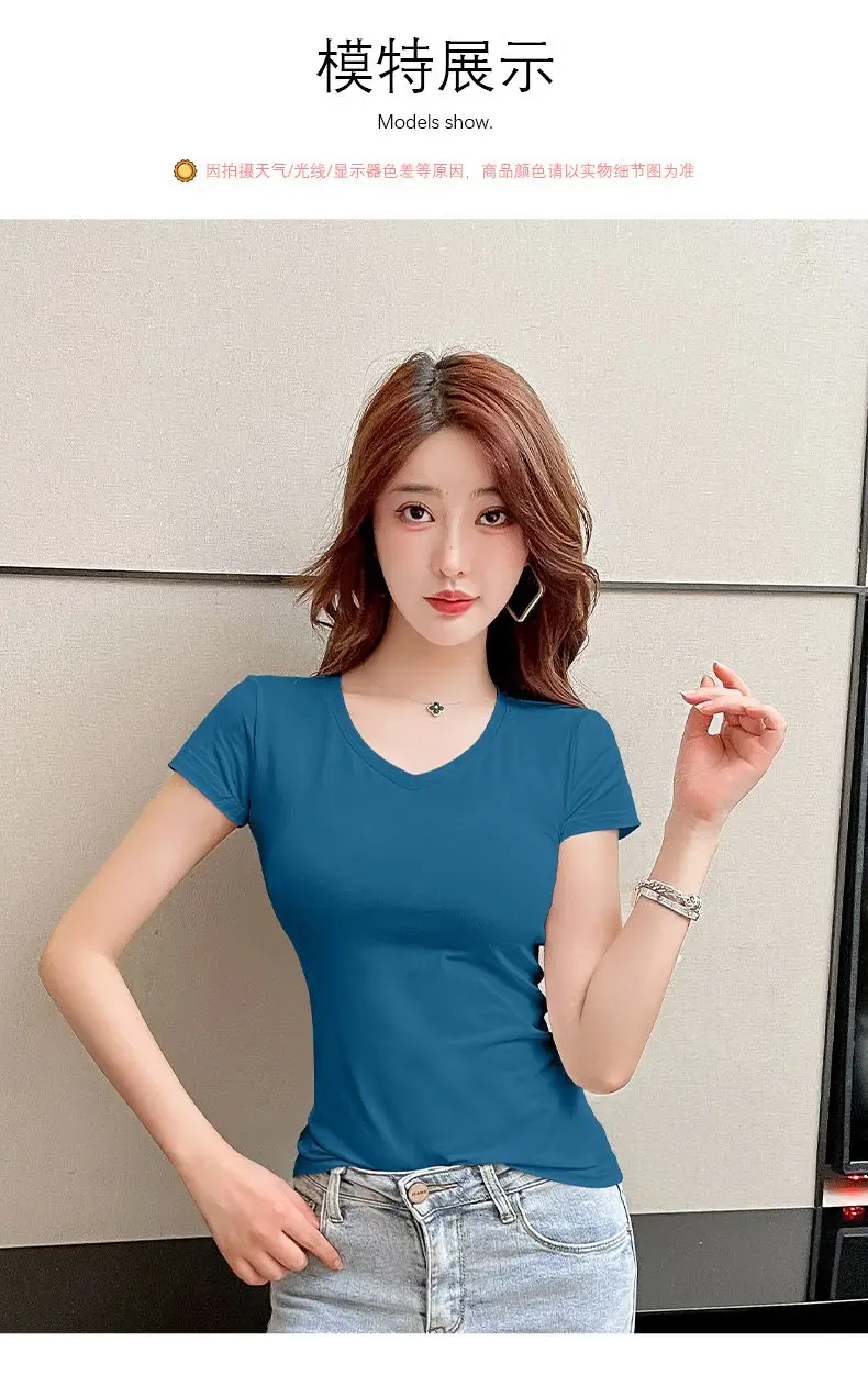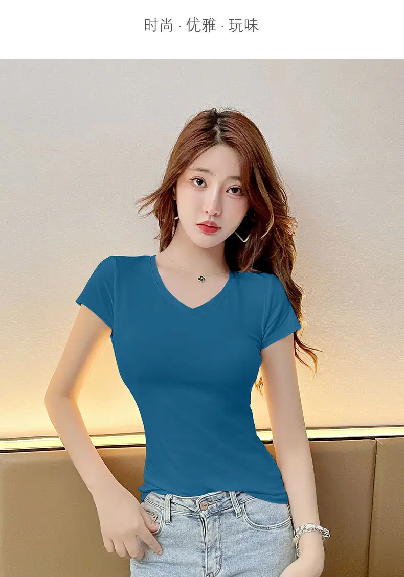 Description: This women’s short-sleeved V-neck T-shirt is a versatile addition to your wardrobe. Made of soft and breathable fabric, it ensures comfort in spring, summer, and autumn. The V-neck design and slim fit add a feminine detail, making it suitable for daily wear, casual outings, or effortless styling. Pair it with jeans, skirts, or shorts for a chic look that can be accessorized to suit various occasions. Stay comfortable and fashionable with this trendy T-shirt.