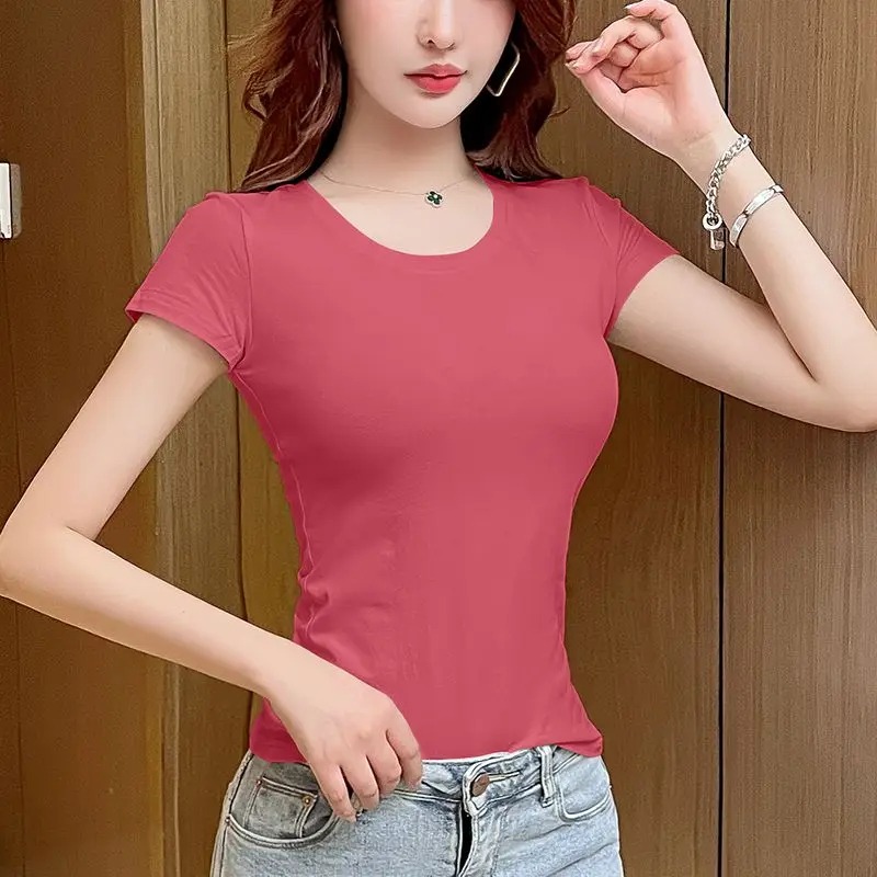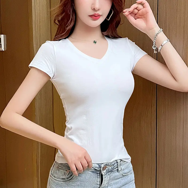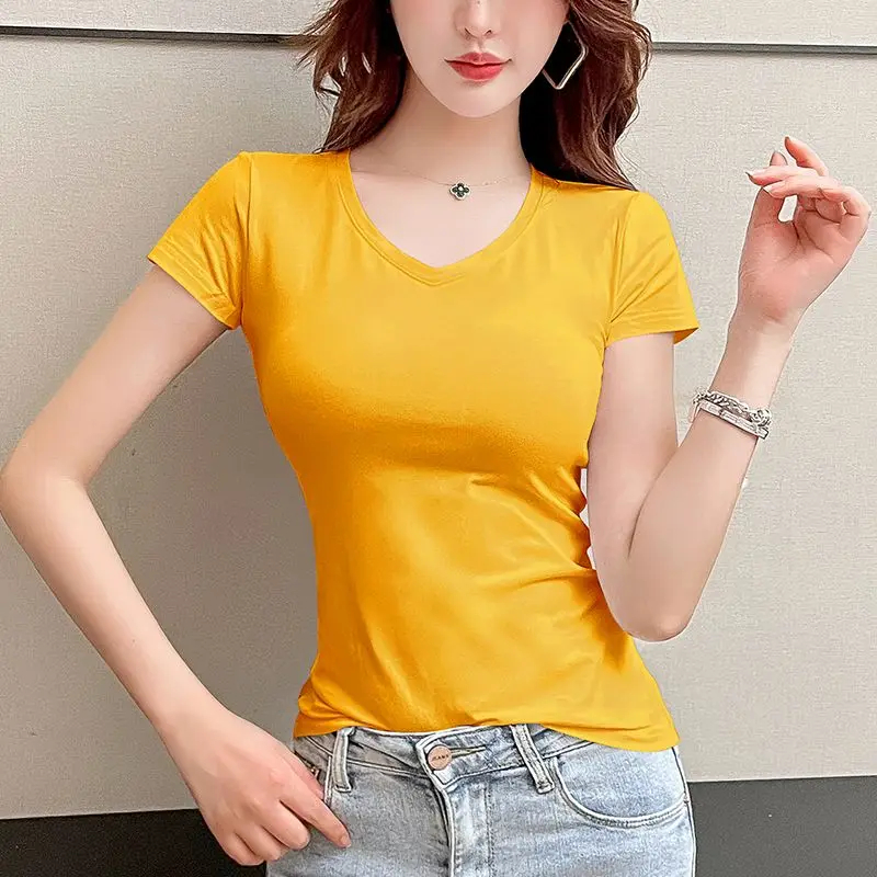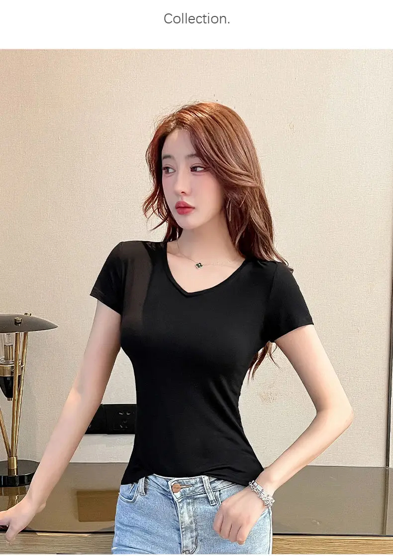Description: This women’s short-sleeved V-neck T-shirt is a versatile addition to your wardrobe. Made of soft and breathable fabric, it ensures comfort in spring, summer, and autumn. The V-neck design and slim fit add a feminine detail, making it suitable for daily wear, casual outings, or effortless styling. Pair it with jeans, skirts, or shorts for a chic look that can be accessorized to suit various occasions. Stay comfortable and fashionable with this trendy T-shirt.