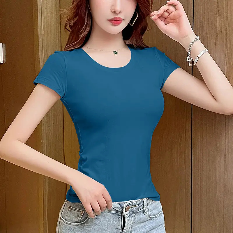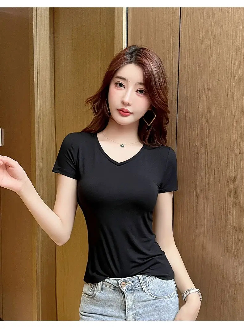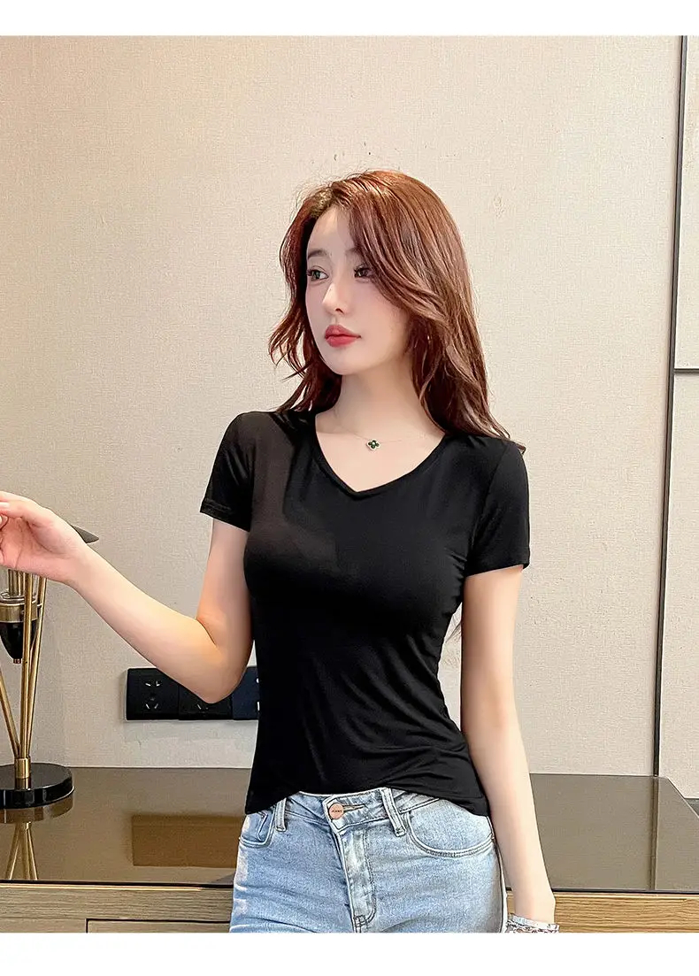 New Arrival Stylish Fashion Women's Summer Blue V-neck T-shirt In Blue Slim 2023 Short Sleeve Stretch Streetwear modal Tee Top