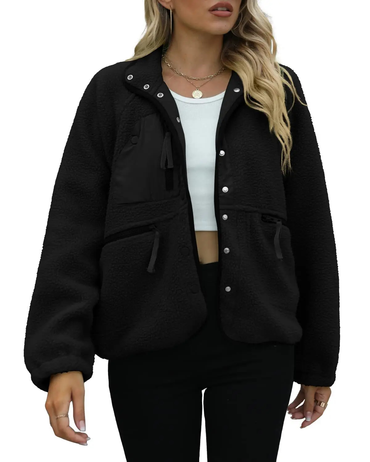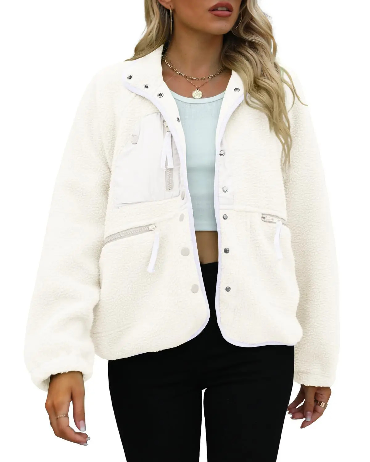 Chic Multi-Pocket Detail: Designed with a mix of zip and snap pockets on the chest and sides, this jacket elevates your outfit with trendy utilitarian flair—these pockets not only enhance style but also offer convenient storage for small essentials like phones or keys, blending fashion with practicality.