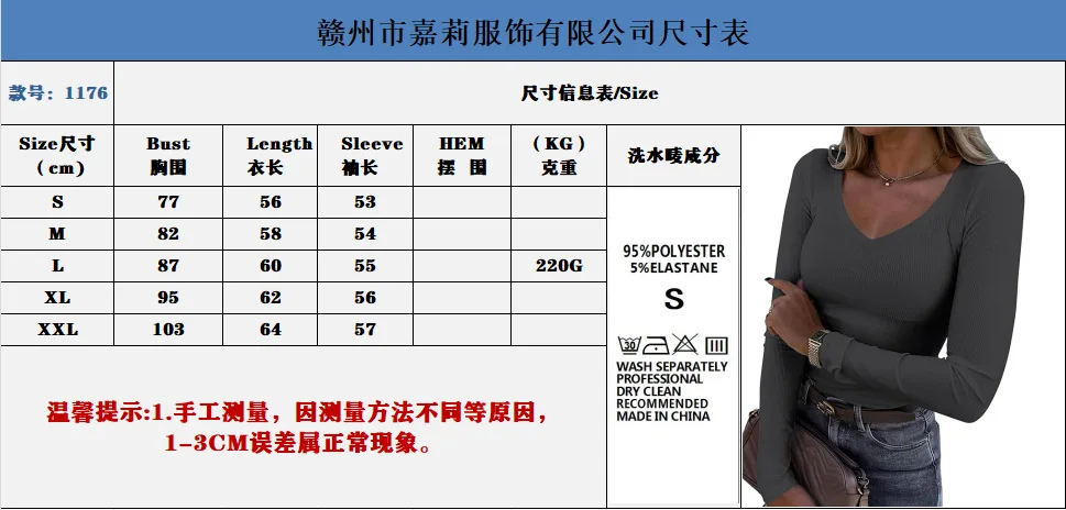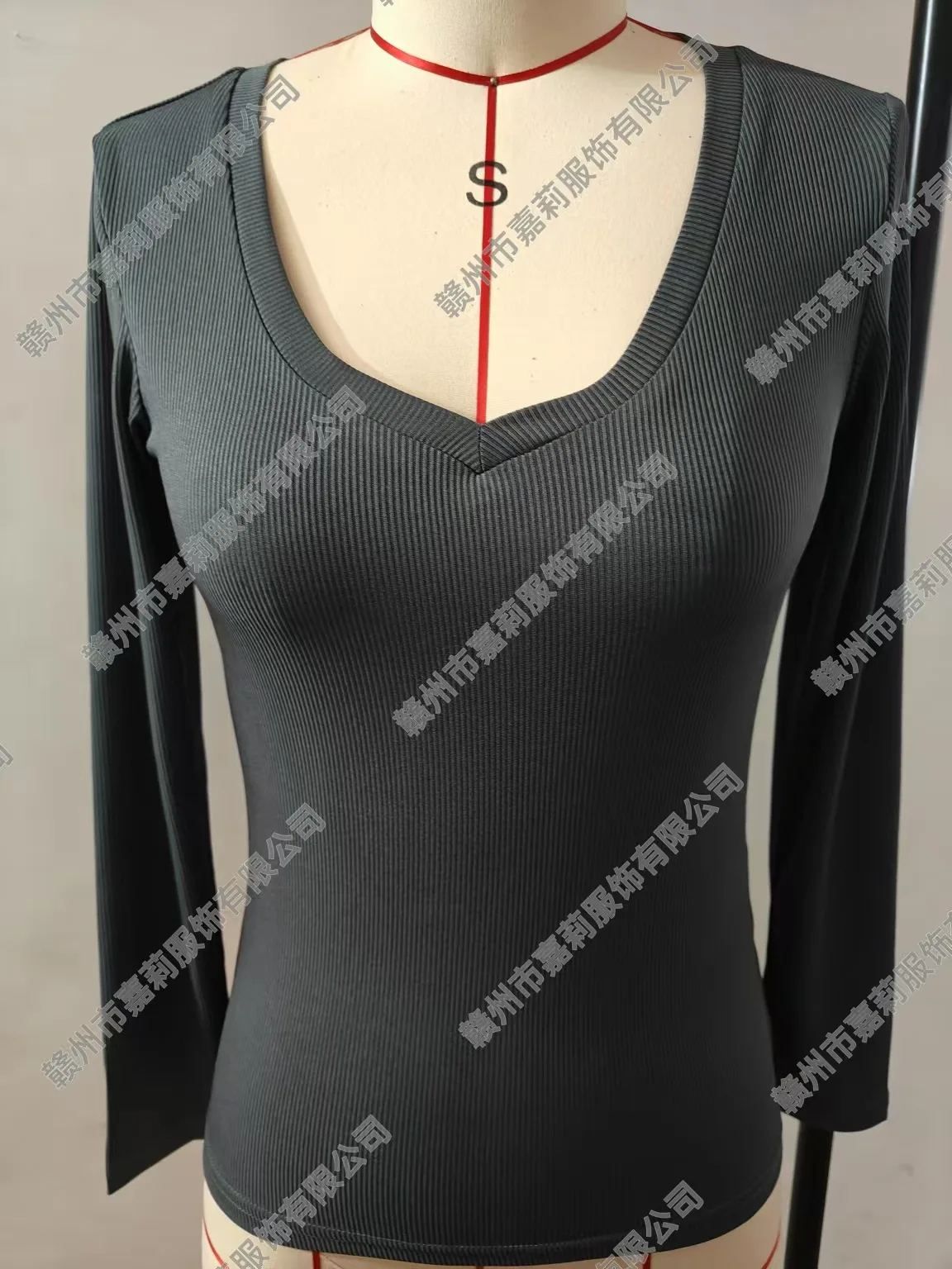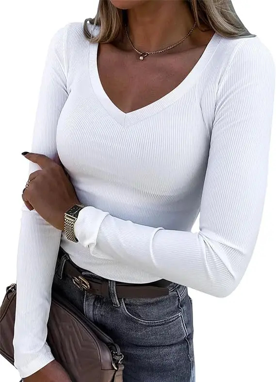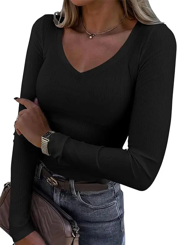 Description: This women’s long-sleeved ribbed top is a versatile addition to your wardrobe. Crafted from soft and stretchy ribbed fabric, it ensures a comfortable and snug fit in spring, autumn, and winter when layered. The flattering V-neck design adds a feminine detail, and the slim fit accentuates your figure, making it suitable for daily wear, date nights, or casual gatherings. Pair it with jeans, skirts, or trousers and accessorize as needed to suit any occasion. Stay comfortable and fashionable with this trendy top.