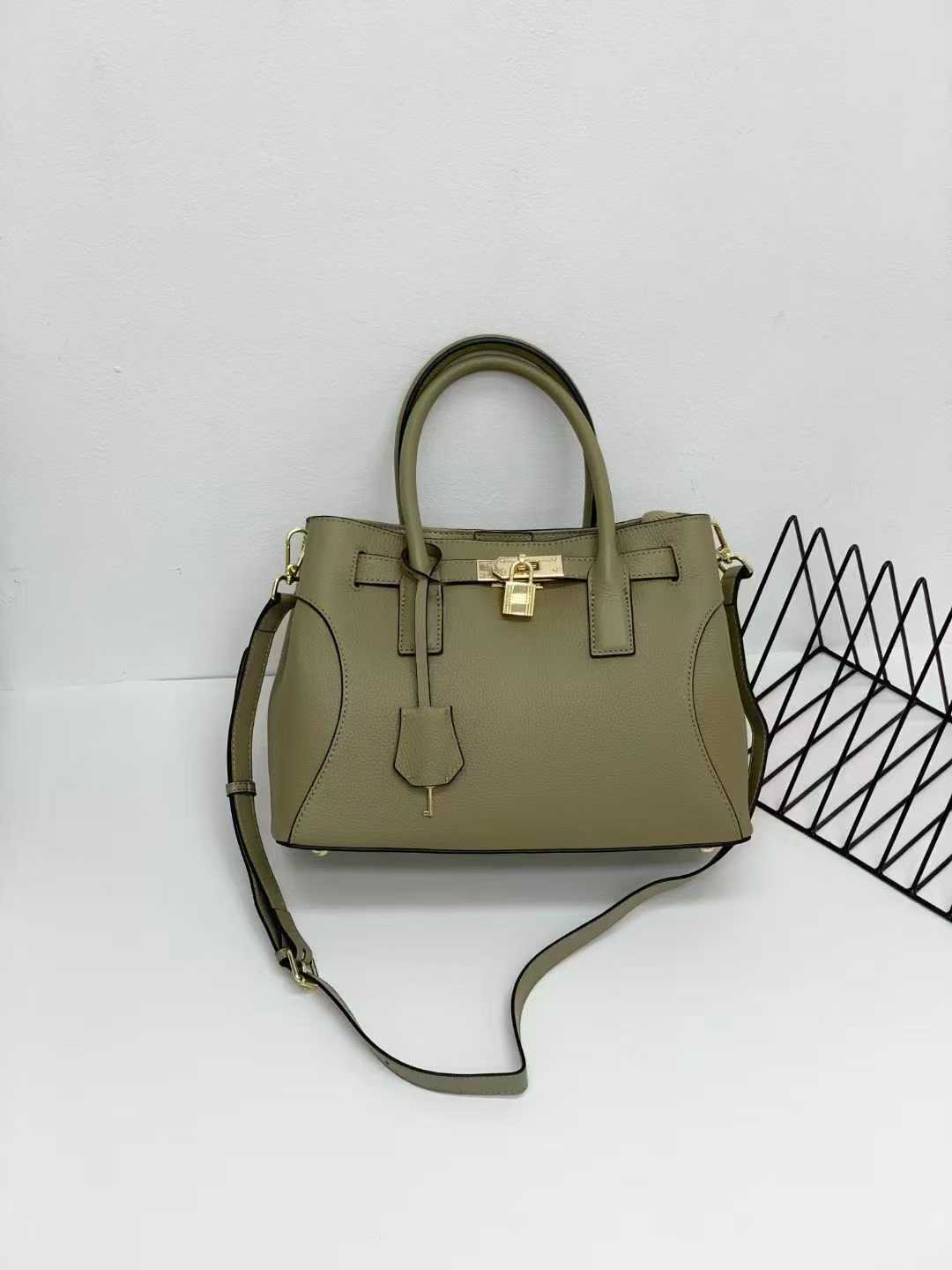 This satchel is a timeless embodiment of elegance and craftsmanship. Crafted from premium olive-textured leather, it features a structured silhouette with dual top handles and a detachable crossbody strap for versatile styling. The gold-tone lock closure and hanging charm add a touch of luxury, making it a standout piece that balances sophistication and functionality.