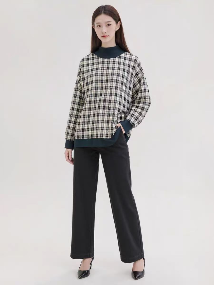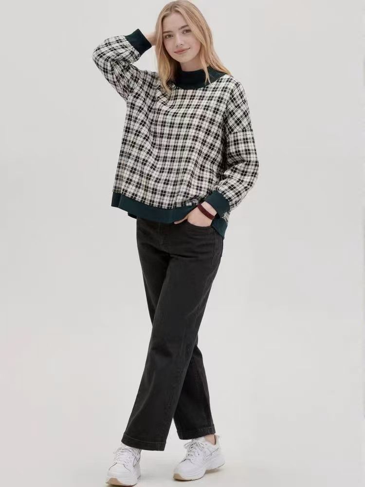 This sweatshirt is a versatile staple that adapts to multiple looks and occasions. Match it with black wide-leg pants and heels for a sophisticated office outfit, or combine it with dark jeans and sneakers for a casual, trendy weekend look. The plaid pattern brings a retro charm, while the contrast trim injects a contemporary vibe. Whether you’re attending a business casual event, going for a coffee run, or simply lounging, this Plaid Mock Neck Sweatshirt keeps you comfortable and fashionable, highlighting how classic elements can be reinvented for modern wear.