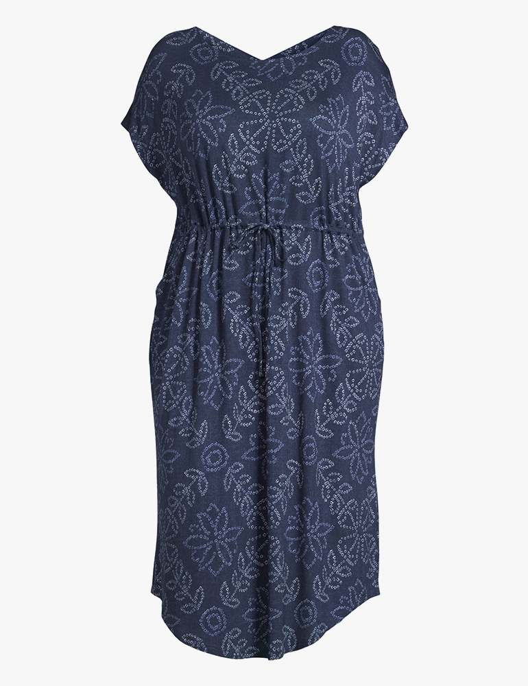This navy blue midi dress is a seamless fusion of relaxed elegance and artistic detailing. It boasts a round neckline, short dolman sleeves, and a drawstring waist that allows for a tailored fit. Embellished with an intricate, nature-inspired pattern in lighter blue tones, the dress falls into a midi-length silhouette, offering both a stylish aesthetic and day-long comfort, ideal for those who value a blend of casual charm and subtle sophistication.
