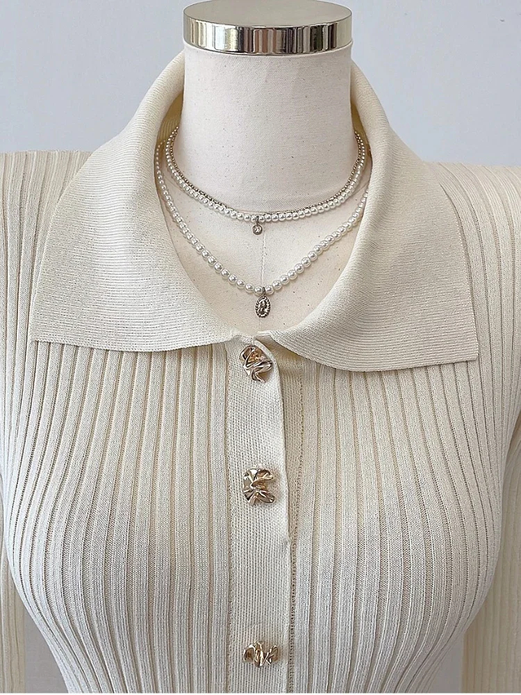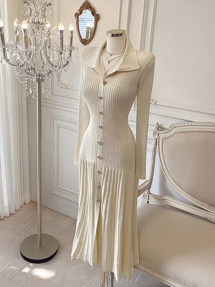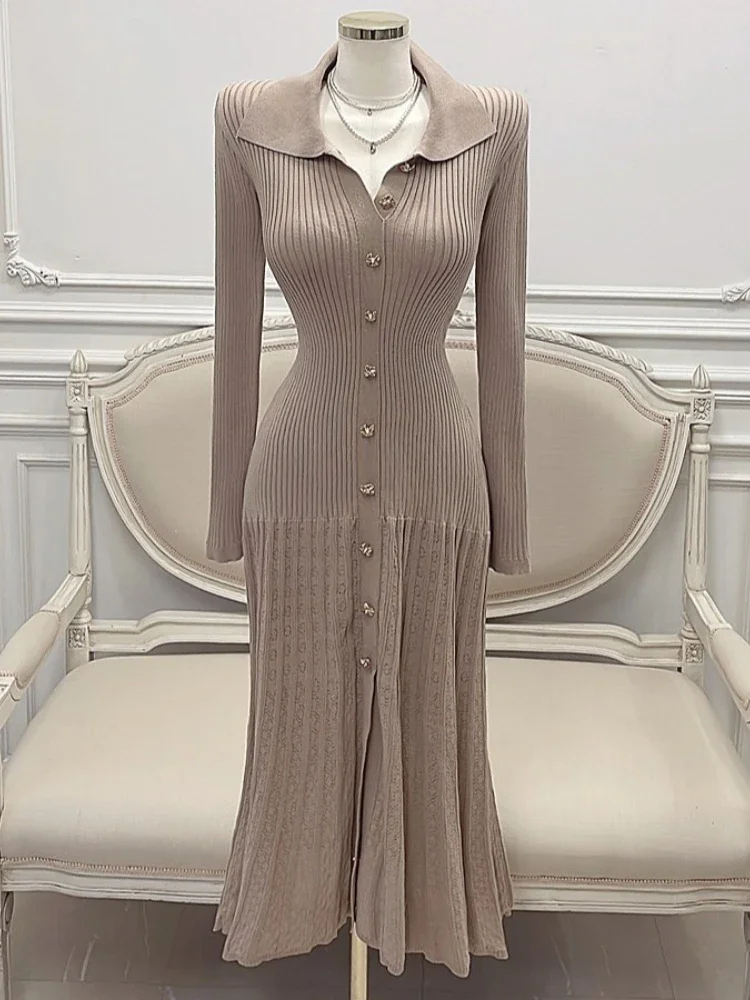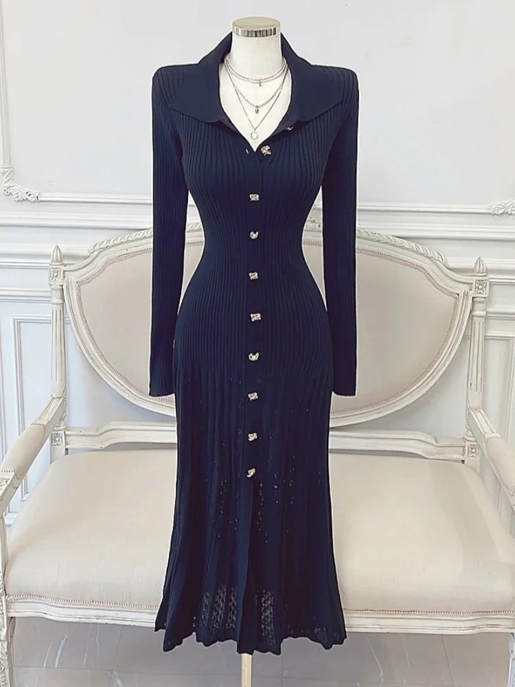 Retro Elegant Knitted Dress Women Long Sleeve Slim Single Breasted Bodycon Dresses Ladies Lapel Hollow Out Long Robe Vestidos