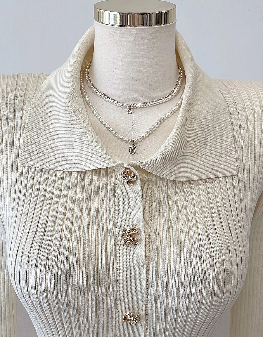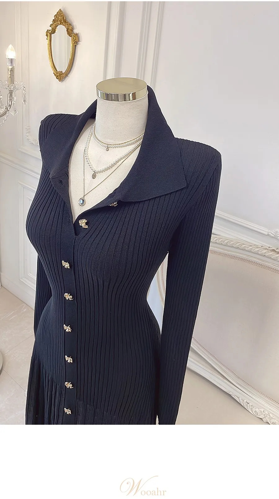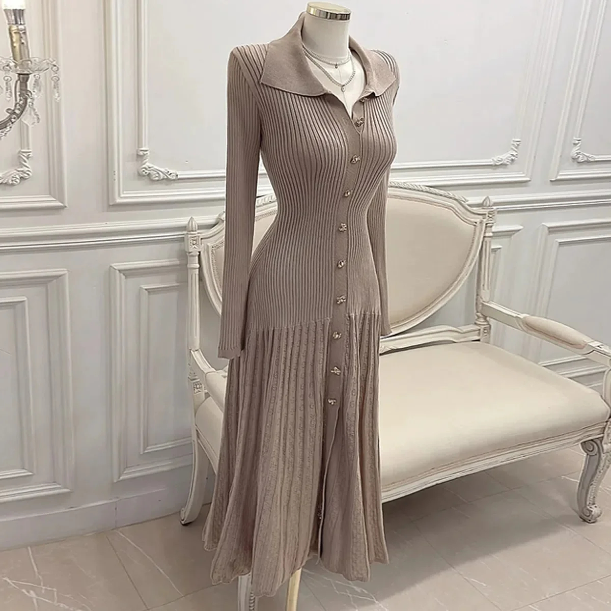 This midi dress features a collared neckline and front button placket, crafted from rib-knit fabric with a pleated skirt for a elegant flow. Long sleeves and a tailored fit flatter the figure, making it suitable for both casual and semi-formal occasions. Pair it with heels or flats for a timeless, chic look.