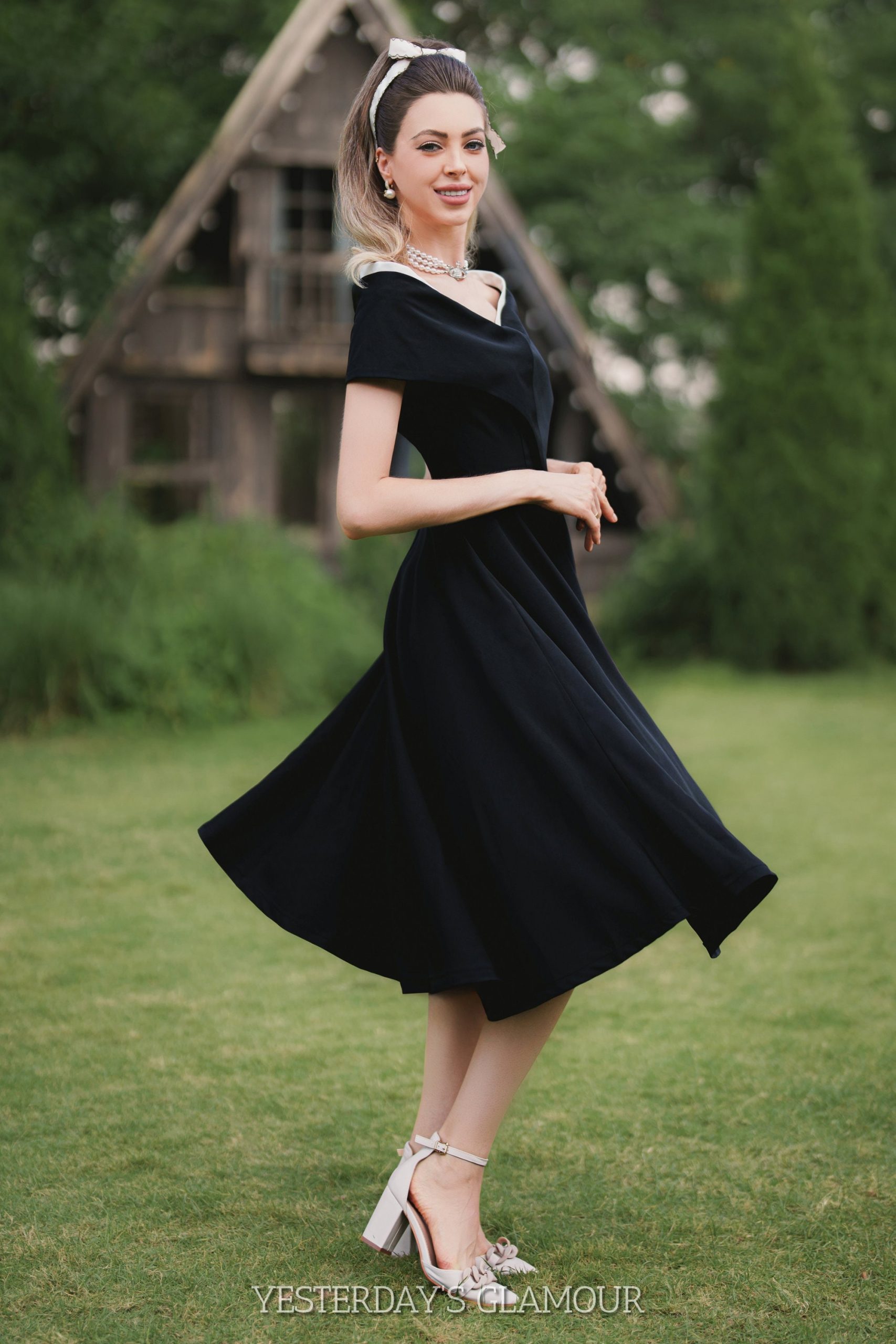 Featuring a contrasting trim along the neckline, this dress adds a refined, eye-catching detail that elevates its vintage-inspired charm. The tailored fit through the waist enhances your silhouette, while the midi length balances sophistication with everyday wearability.