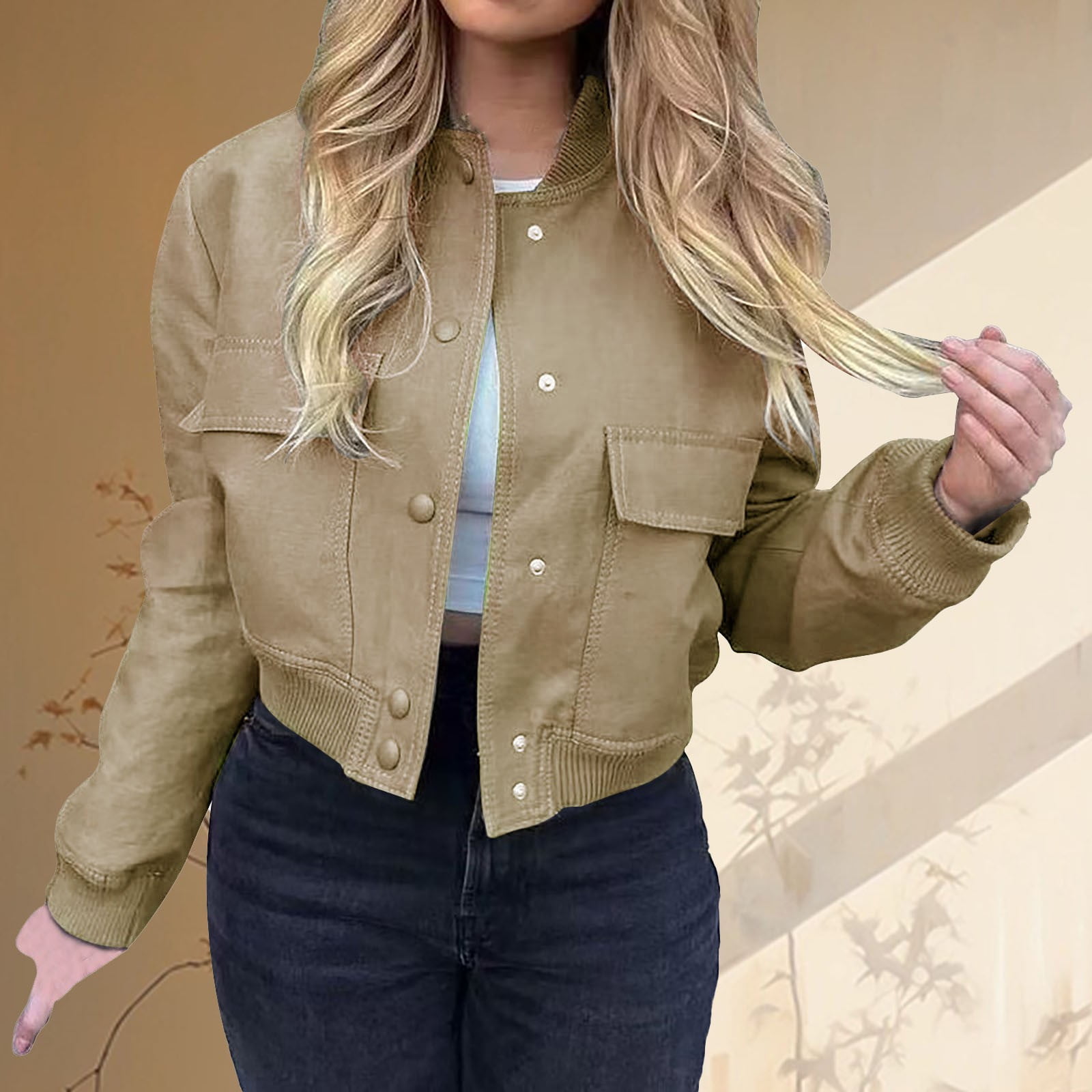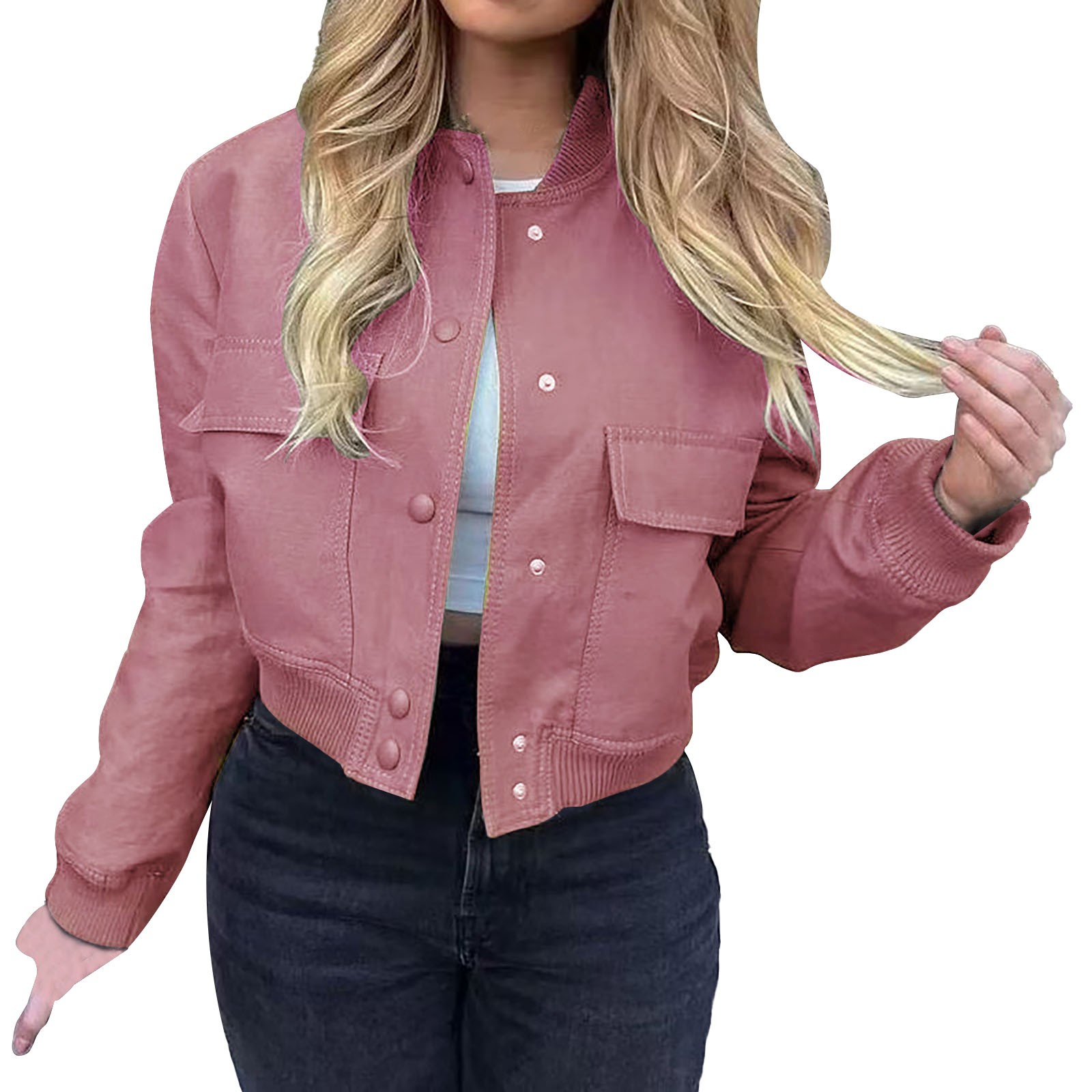 This women’s cropped bomber jacket is a versatile addition to any closet. Made from smooth, lightweight synthetic leather-like fabric, it offers year-round comfort for transitional seasons. Its classic ribbed details, button-front closure, and front flap pockets blend timeless style with modern functionality. The cropped fit flatters your figure, making it ideal for daily wear, casual hangouts, or trendy street style. Pair it with high-waisted bottoms and your favorite shoes to create endless chic looks — stay stylish, comfortable, and on-trend with this essential jacket.