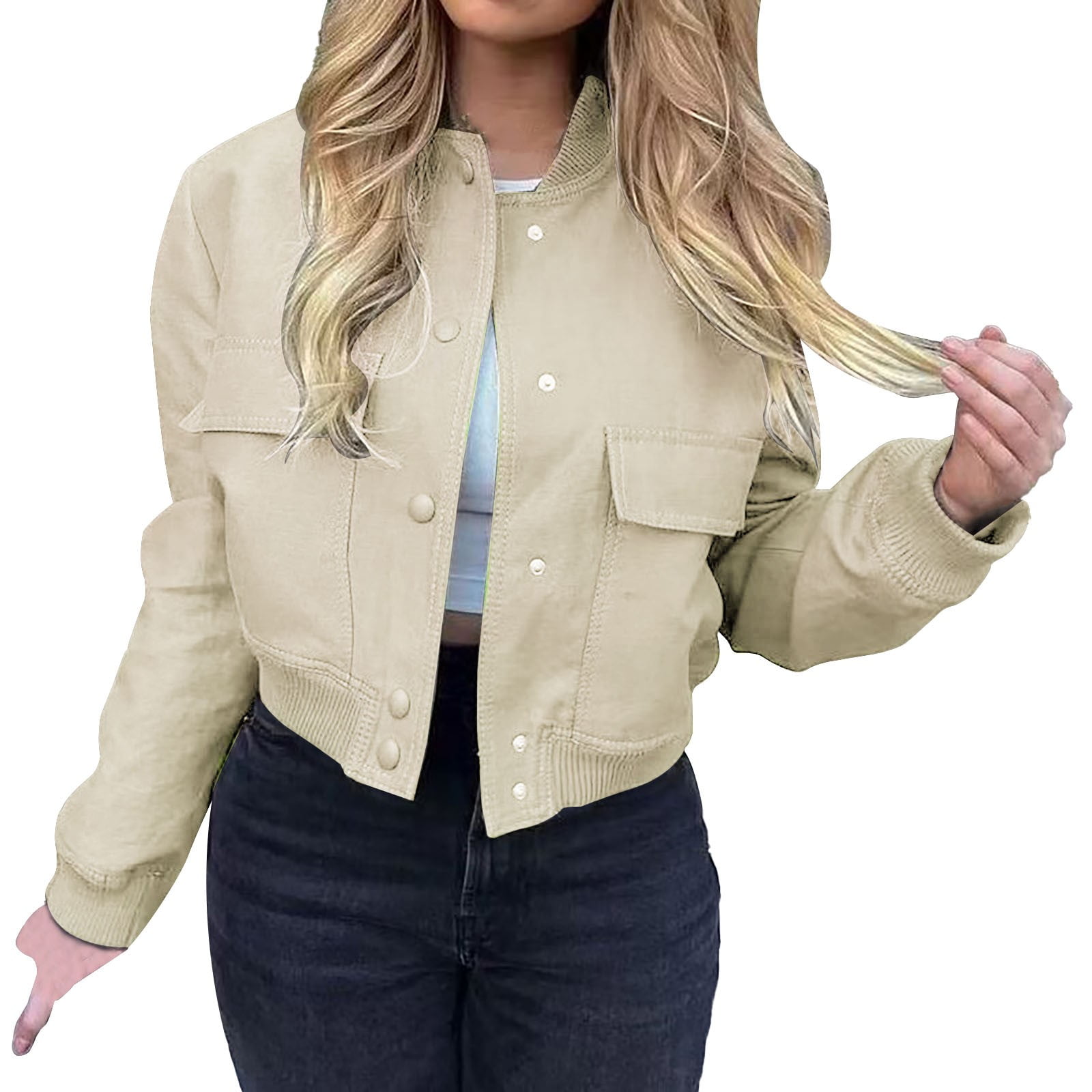 Winter Coat for Women Womens Cropped Jacket Stand Collar Long Sleeve Zip Up Shackets Bomber Jacket Coats with Pockets