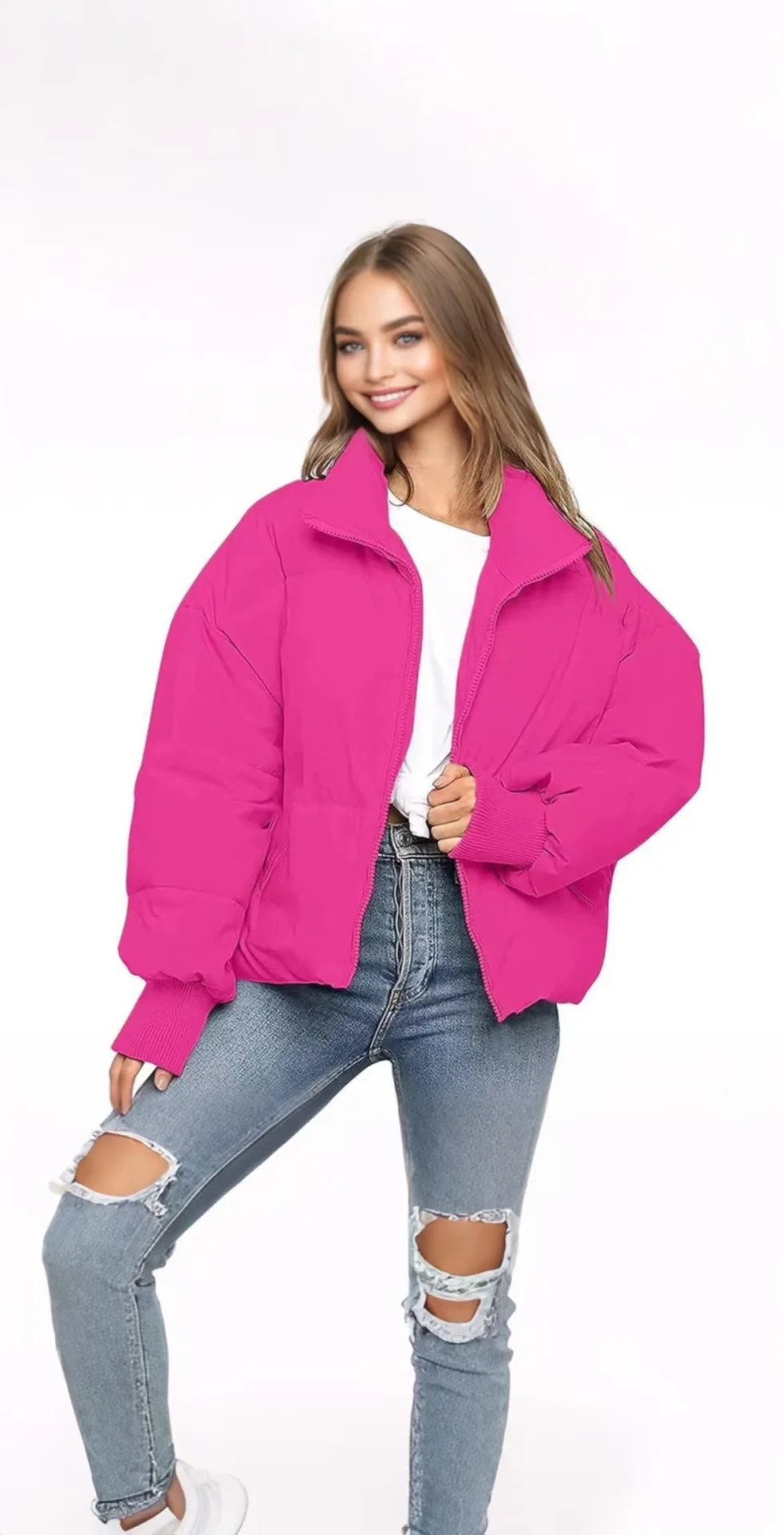 Description: This women’s long-sleeved jacket is a versatile addition to your winter wardrobe. Made of warm and comfortable padded fabric, it keeps you cozy during the cold season. The stand-up collar adds a sophisticated touch and practical functionality, while the side pockets enhance both style and utility. The relaxed fit is comfortable and figure-friendly, making it suitable for daily wear, casual outings, or winter social events. Pair it with jeans, leggings, or skirts and accessorize as needed to create chic looks for various winter occasions. Stay warm and fashionable with this trendy winter jacket.