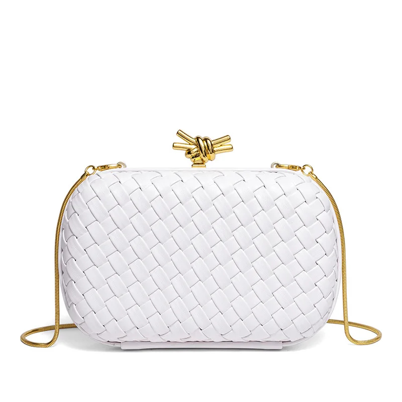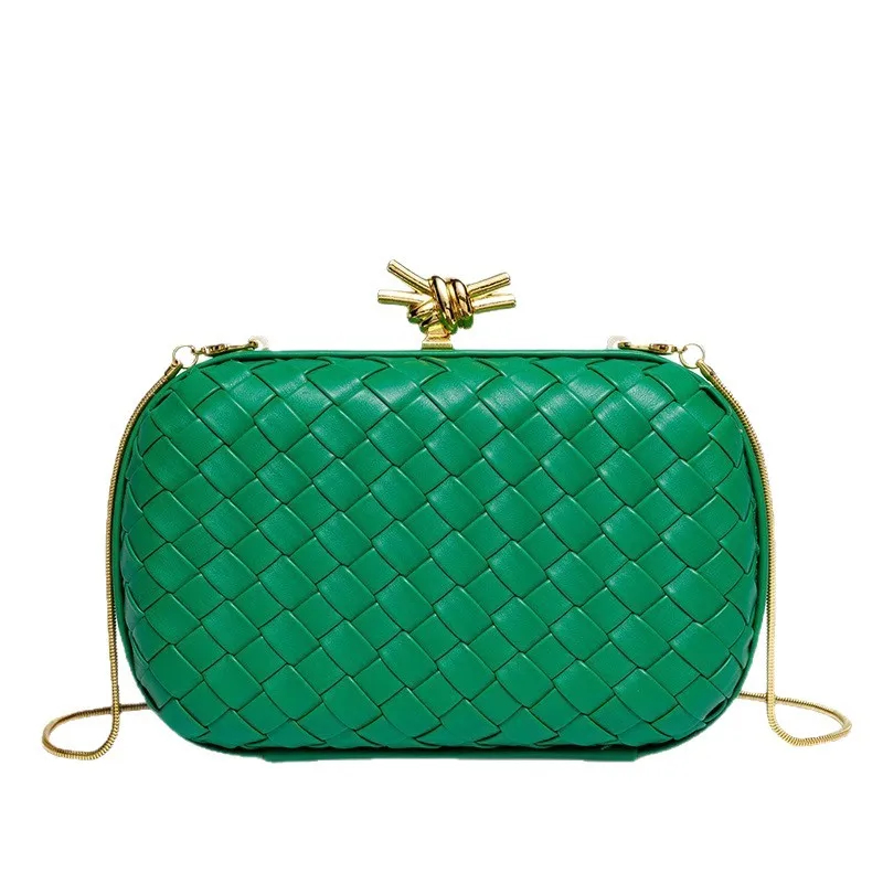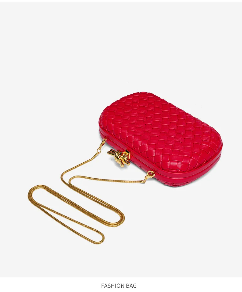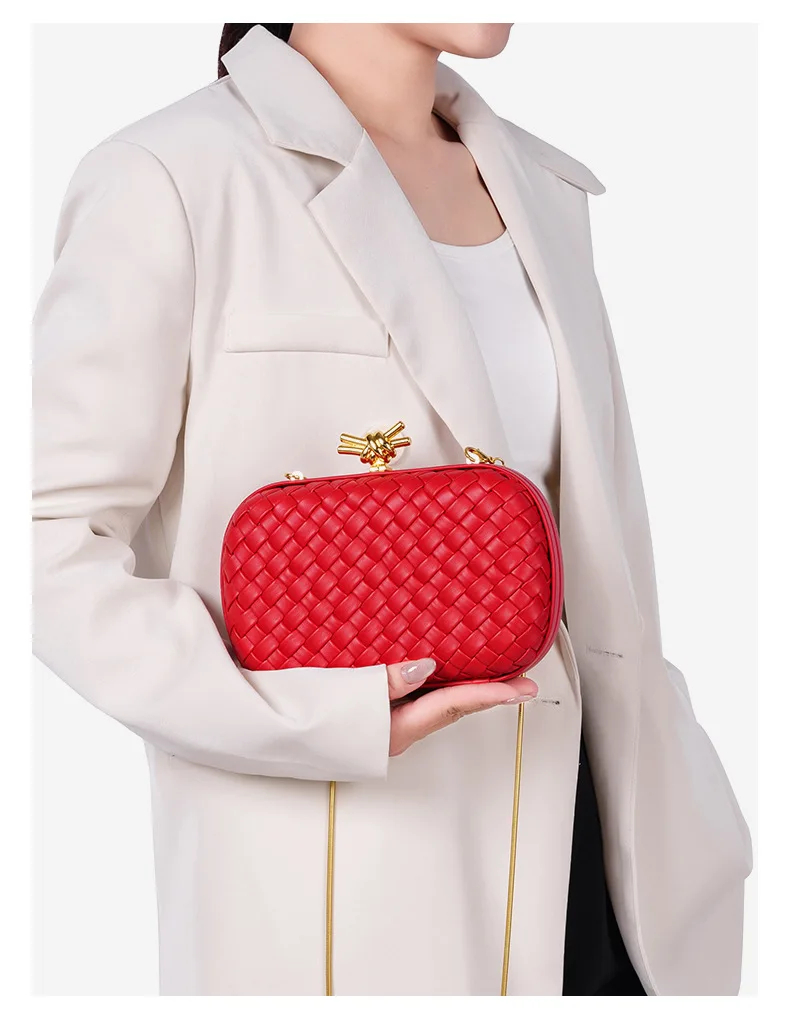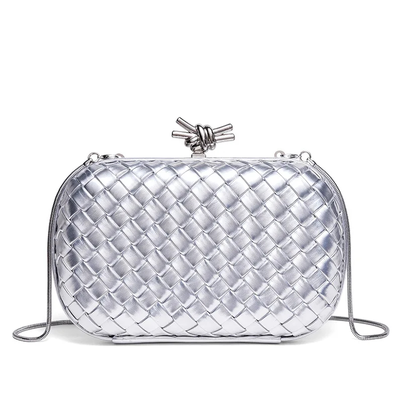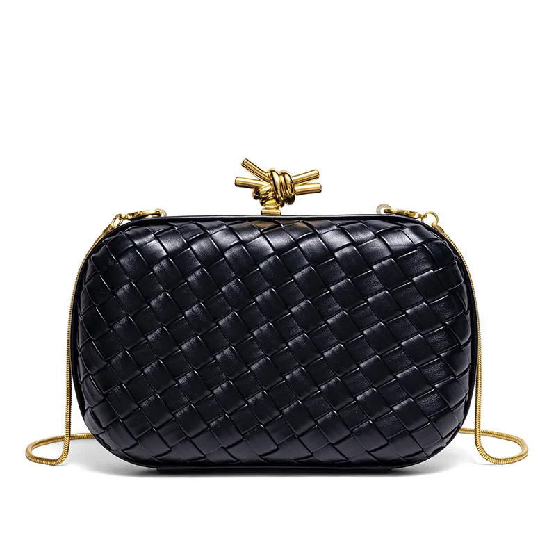 Description: This stylish bag is a versatile addition to your accessory collection. Made of luxurious woven material, it ensures a refined aesthetic and longevity. The unique gold-tone hardware and chain strap add a fashionable element, while the clutch silhouette offers practical storage for essentials. Its formal design flatters any outfit, making it suitable for special events, evening wear, or upscale gatherings. Pair it with evening gowns, dresses, or suits for a chic look that adapts to various formal settings. Stay stylish and sophisticated with this trendy bag.