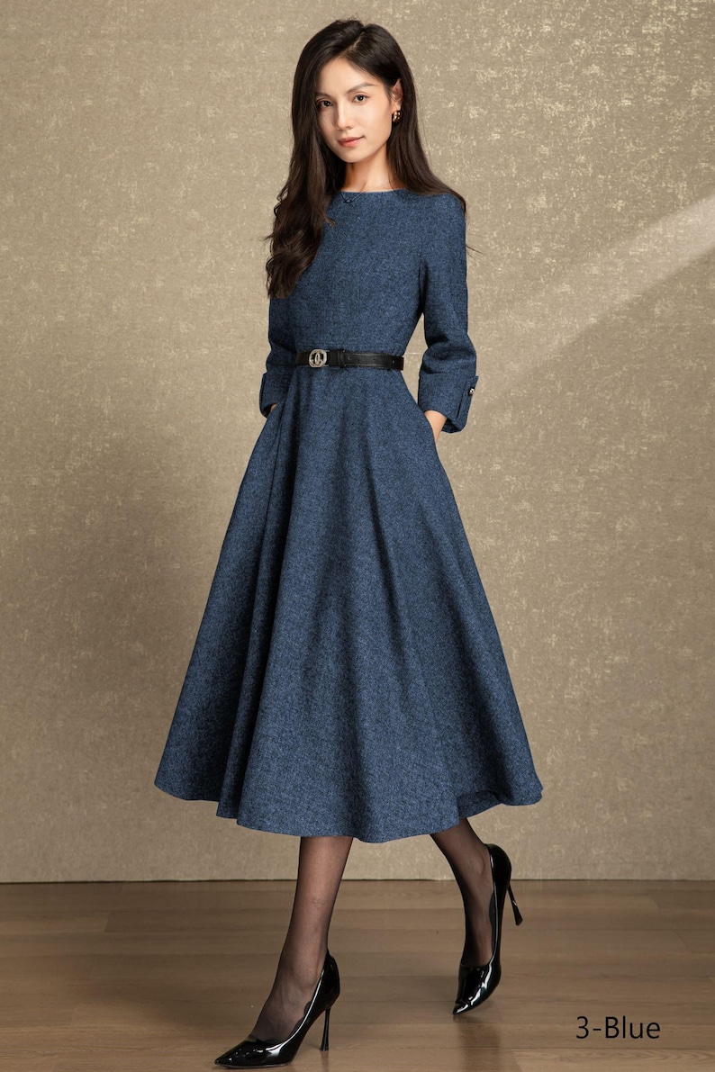 Description: This women’s midi dress is a timeless addition to your wardrobe, blending texture, comfort, and elegance. Made from premium woven fabric, it offers a structured yet soft feel that suits cooler seasons. The tailored bodice, voluminous skirt, and decorative belt flatter your figure, while 3/4 sleeves and side pockets add practical, stylish details. Suitable for everything from formal outings to polished daily wear, pair it with different shoes and accessories to adapt the look to any setting—stay confident and effortlessly fashionable in this versatile piece.