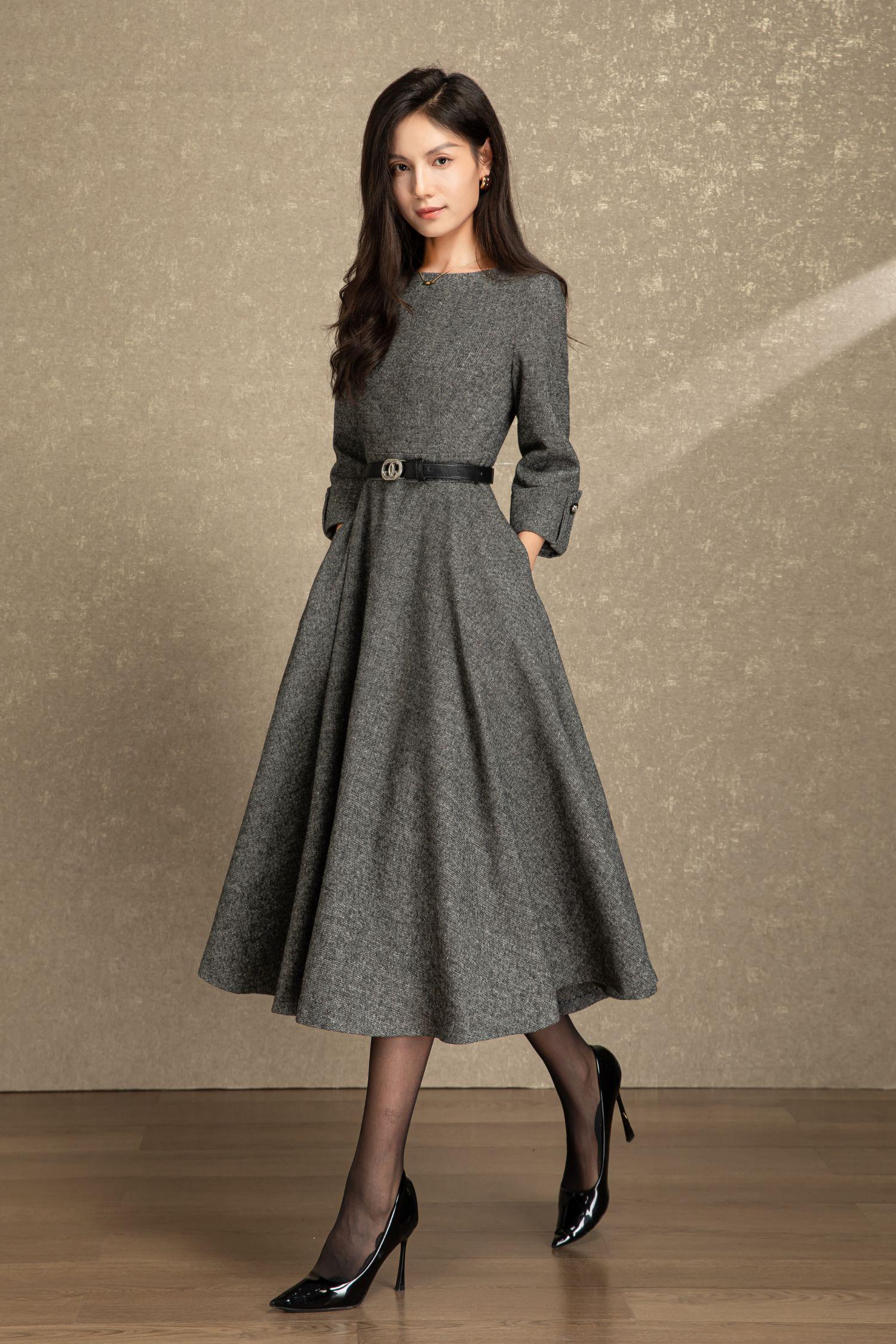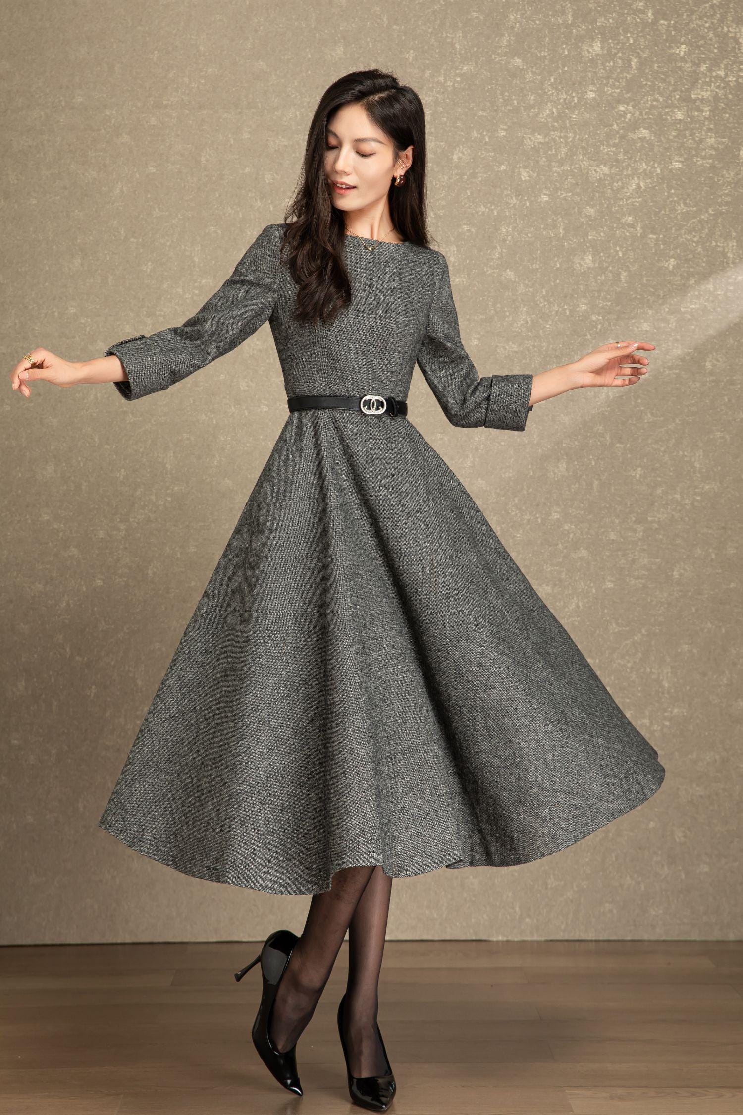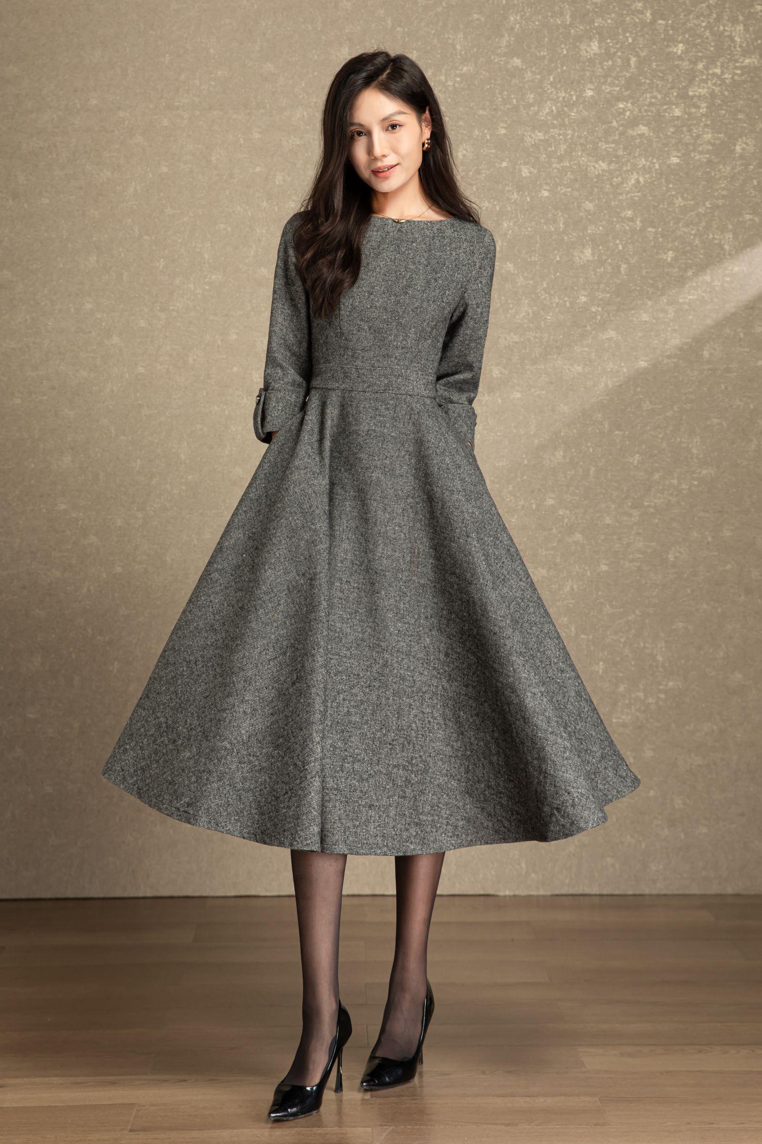 Swing wool dress women, Fit and flare dress, Grey wool dress, Midi wool dress, Warm Winter wool dress, Handmade dress, Ylistyle C4495