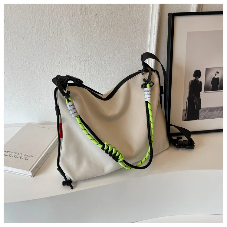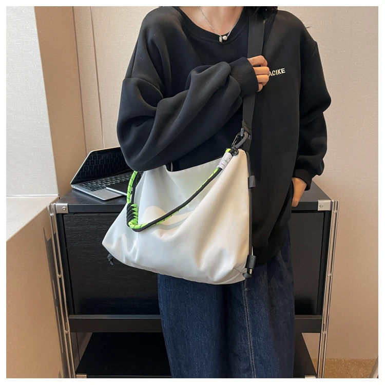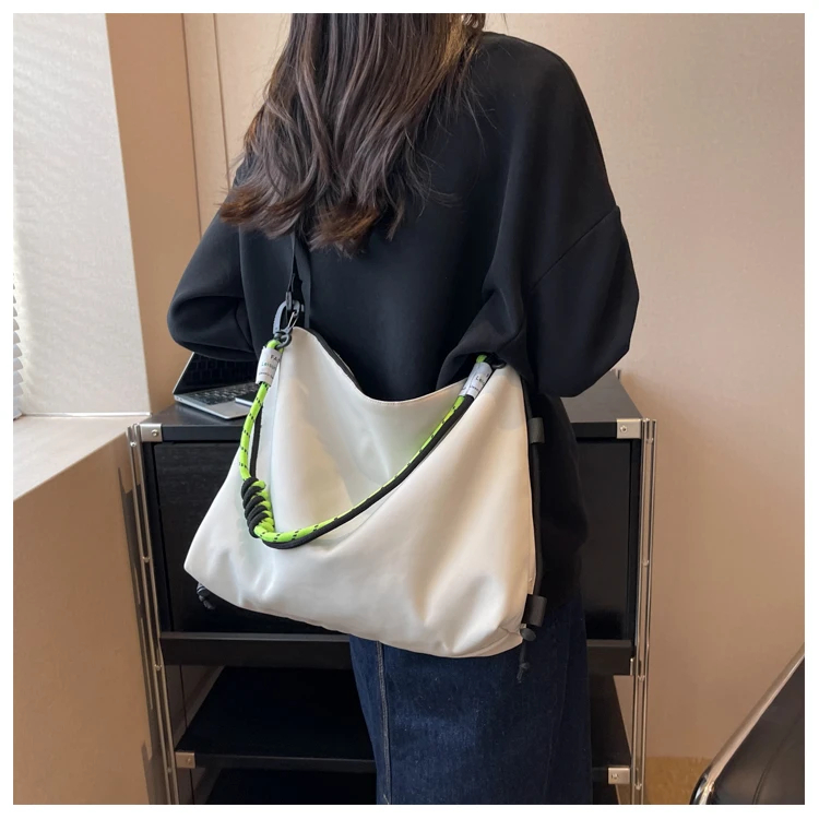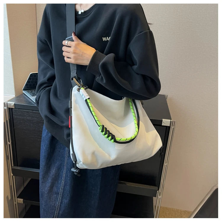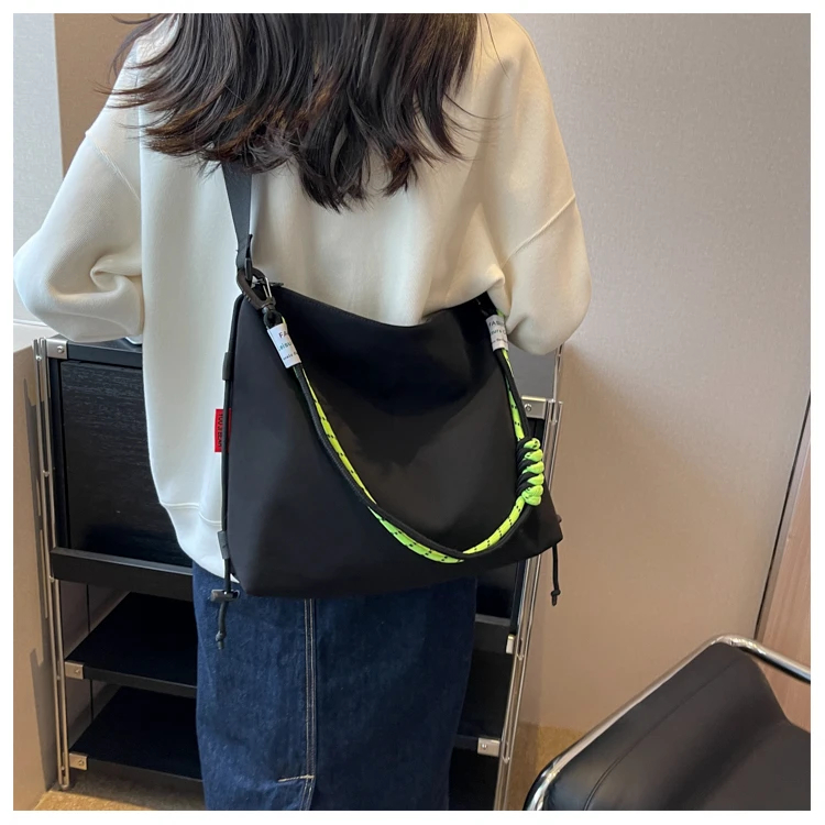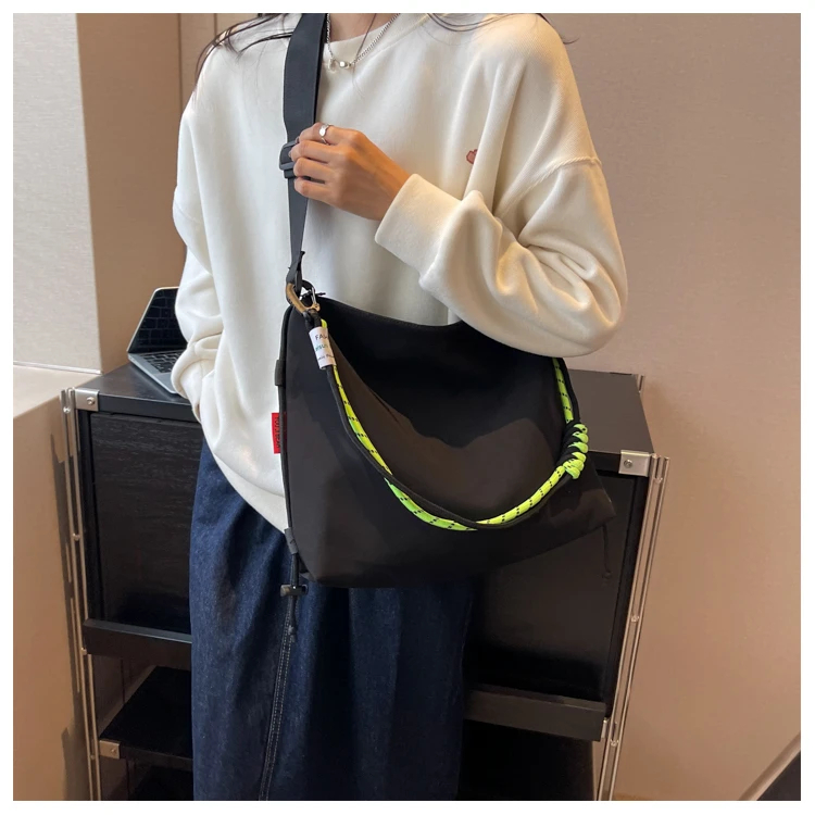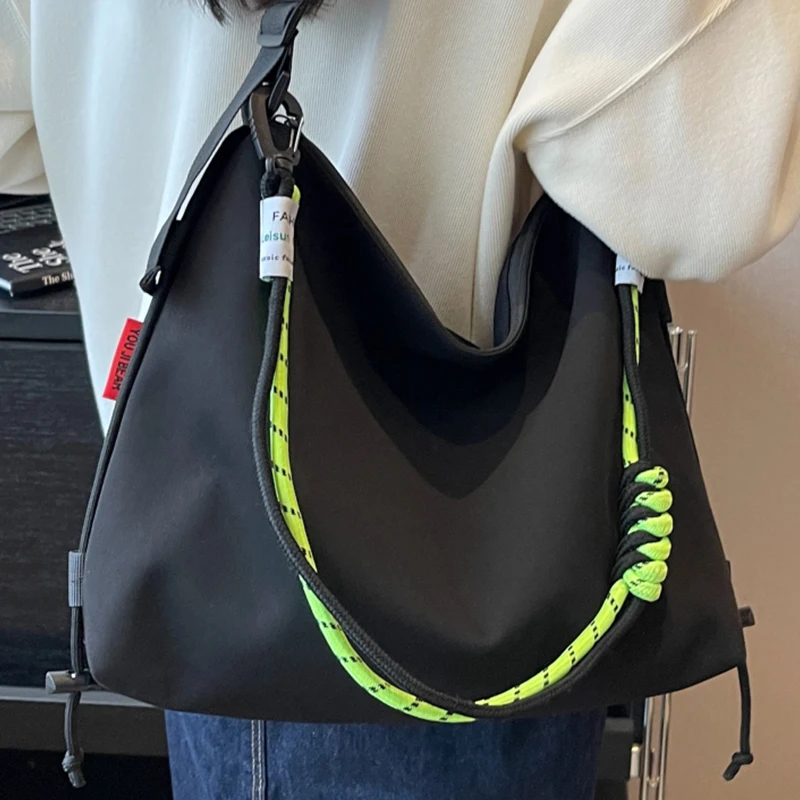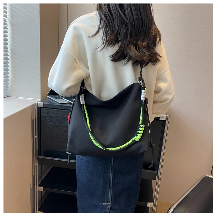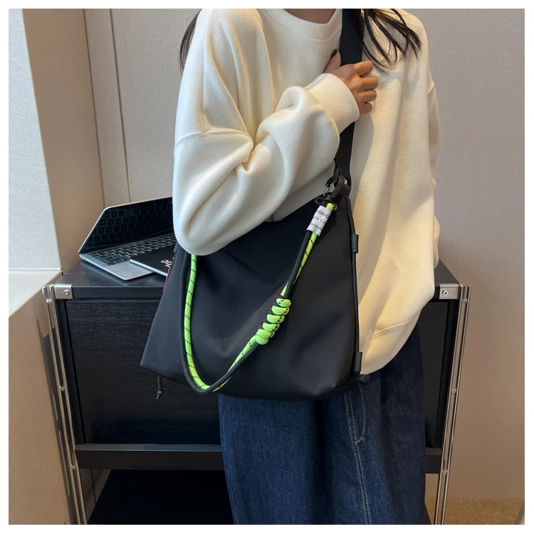Description: This nylon bag is a versatile addition to your accessory collection. Made of stylish and durable material, it brings a touch of bold trendiness to your looks in any season. The neon contrast strap and braided detail add a unique touch, and the spacious capacity ensures practicality. Its versatile carry options make it suitable for daily commutes, weekend outings, or urban adventures. Pair it with different outfits to elevate your style and stay fashionable with this trendy bag.