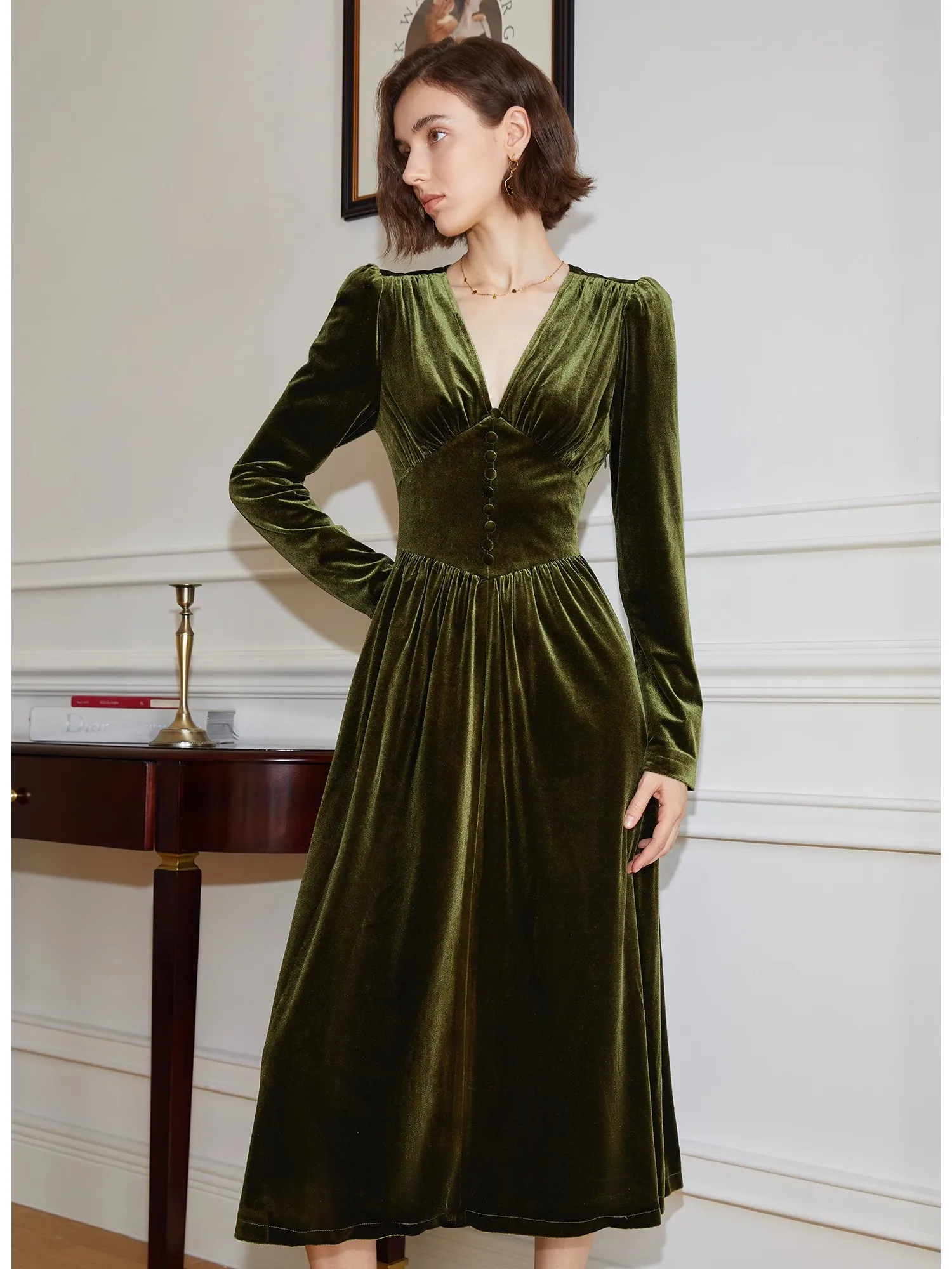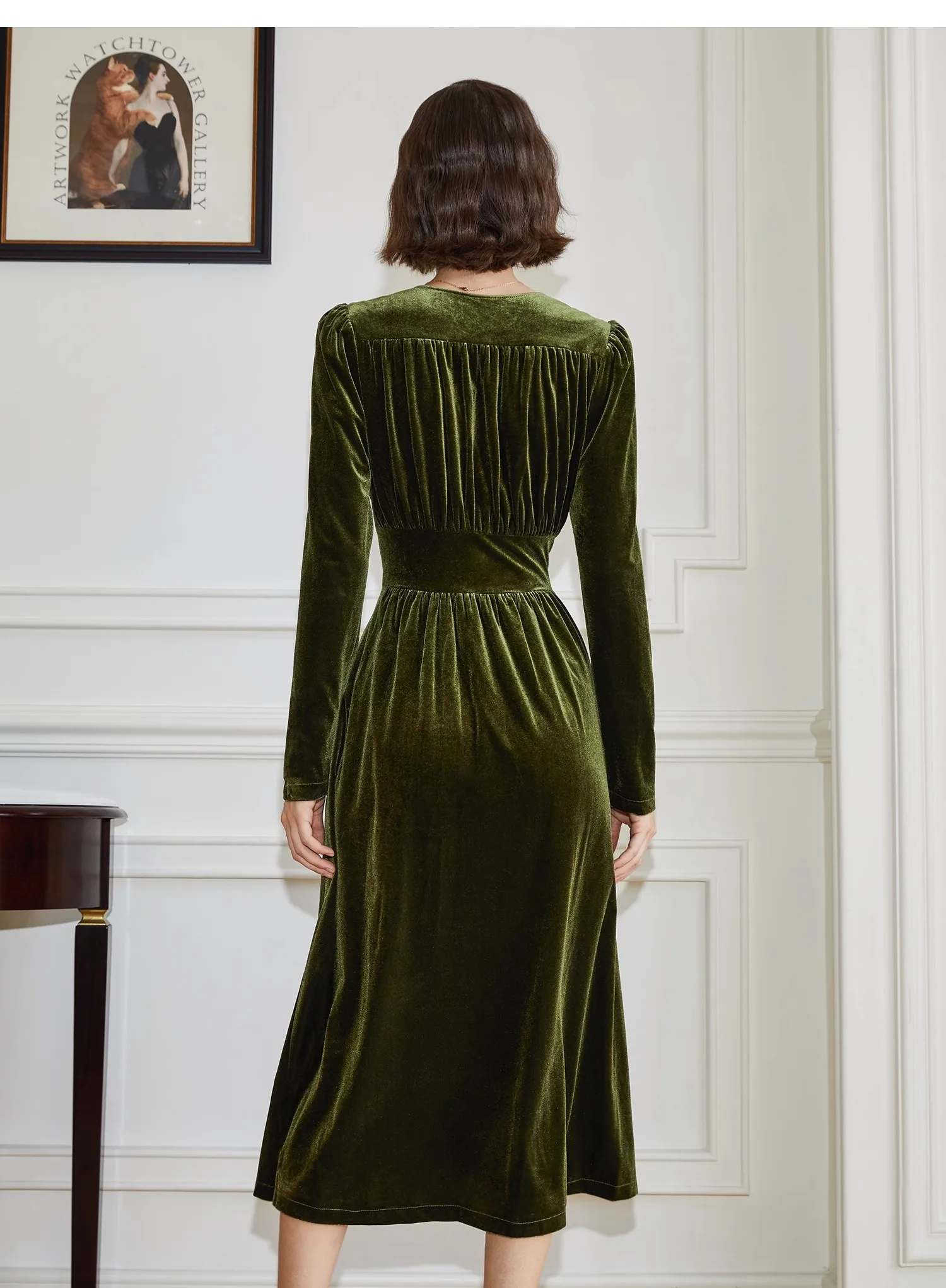 Velvet V-Neck Dress Women'S 2023 Autumn/Winter New High End French Vintage Green Slim Fit Waist Drop Mid Length Dress