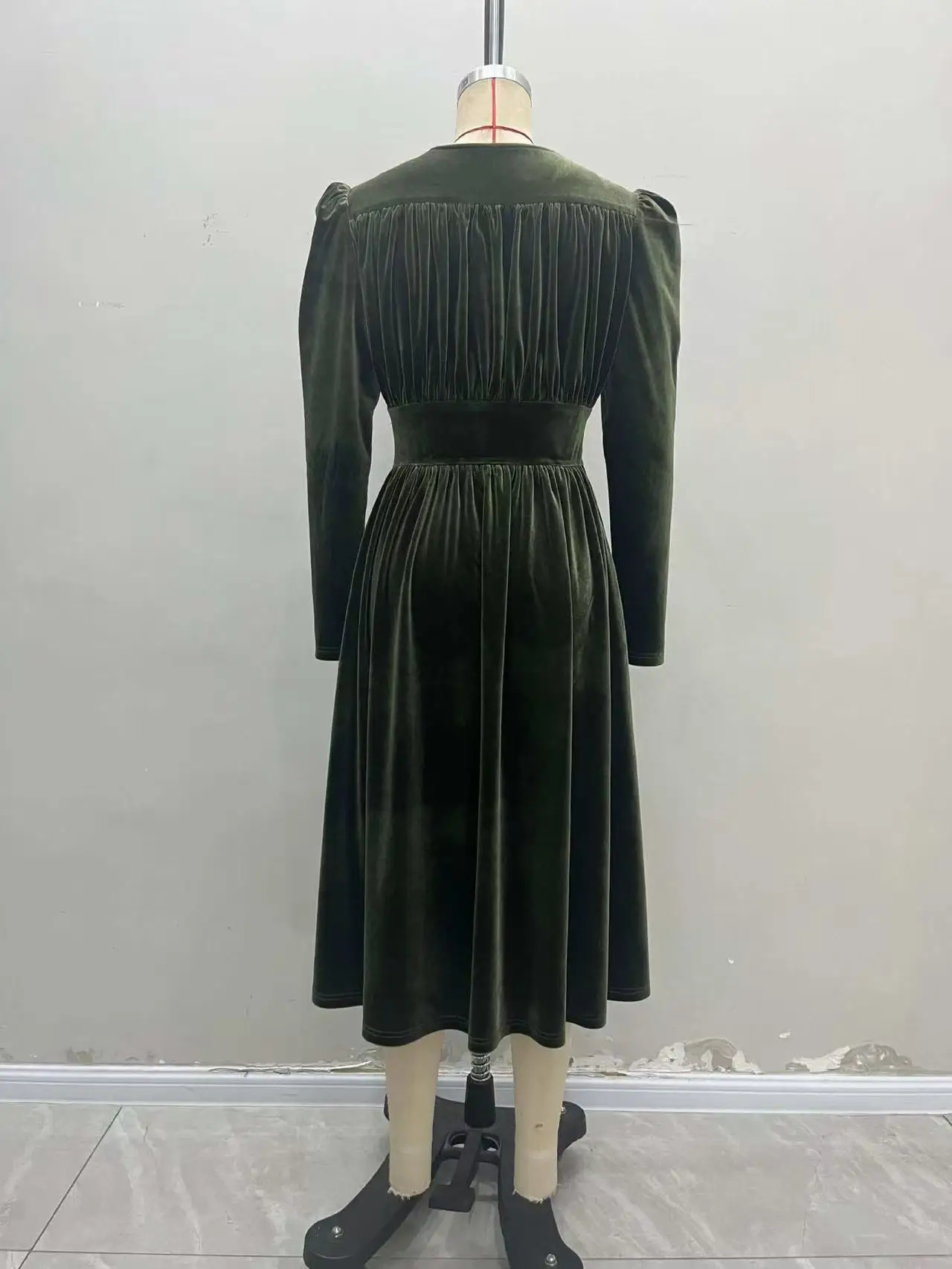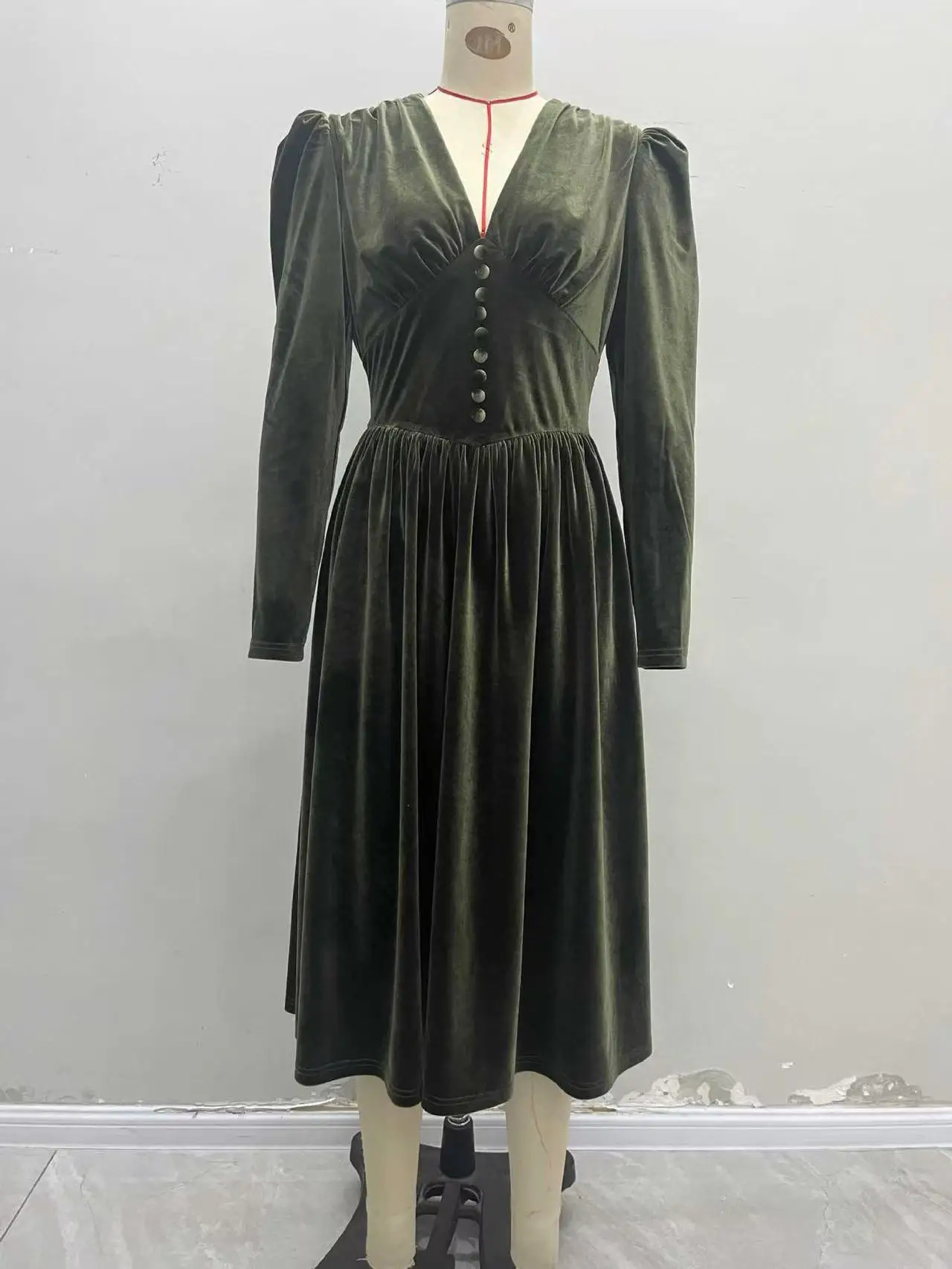 Description: This women’s long-sleeved dress is a versatile addition to your wardrobe. Made of premium velvet fabric, it exudes sophistication for formal or evening settings. The V-neckline and puff sleeves add a stylish element, and the tailored fit flatters your figure, making it suitable for parties, formal outings, or elegant events. Pair it with heels or sandals and complementary accessories for a chic look that adapts to various occasions. Stay elegant and confident with this trendy dress.