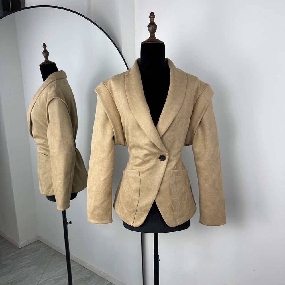 Description: This women’s long-sleeved structured blazer is a versatile addition to your wardrobe. Made of soft and textured fabric, it ensures style and sophistication in spring, autumn, and winter. The oversized shoulders and single-button design add a bold detail, and the cinched-waist fit flatters your figure. Suitable for office wear, formal events, or stylish outings, pair it with dresses, skirts, or pants for a chic look that can be accessorized to suit various occasions. Stay comfortable and fashionable with this trendy blazer.
