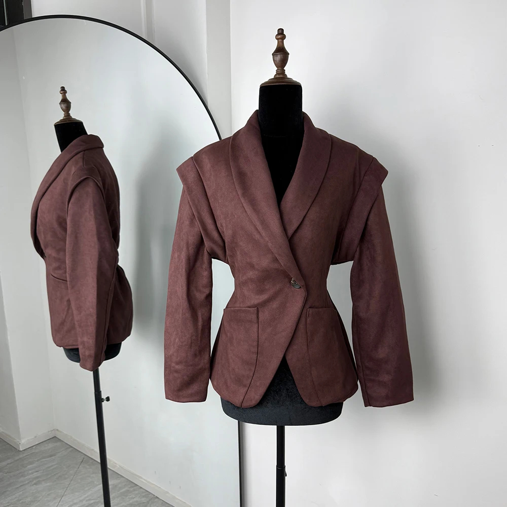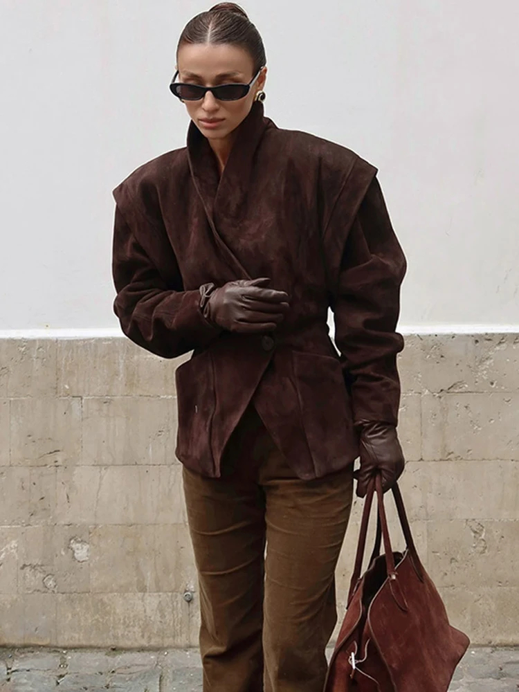 Vintage Brown Suede Jacket Women Fashion Solid V Neck Long Sleeve Pocket Lapel Single Button Coat Fashion Street Outwear