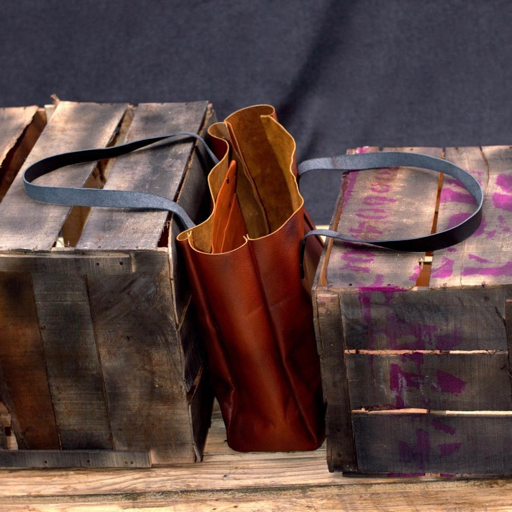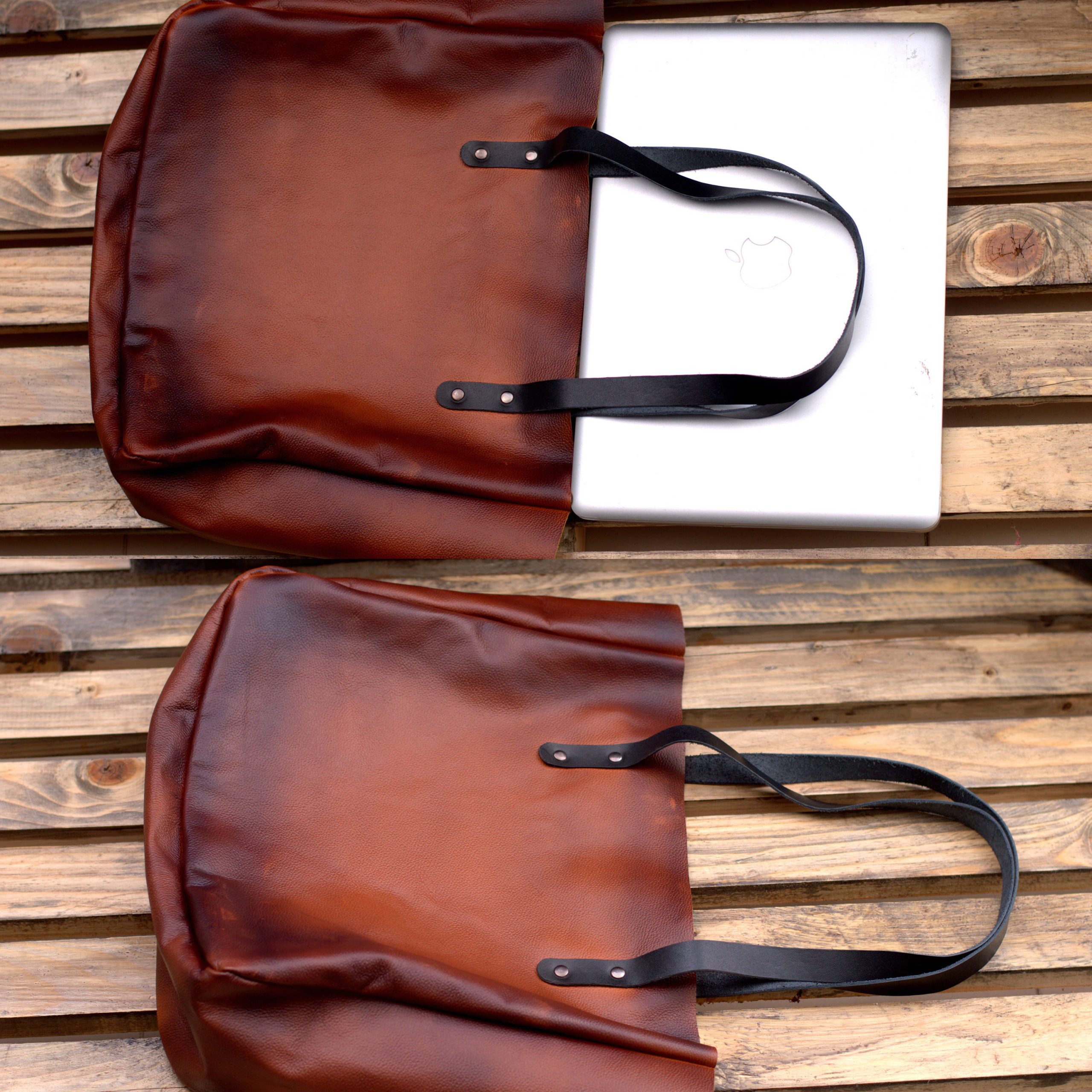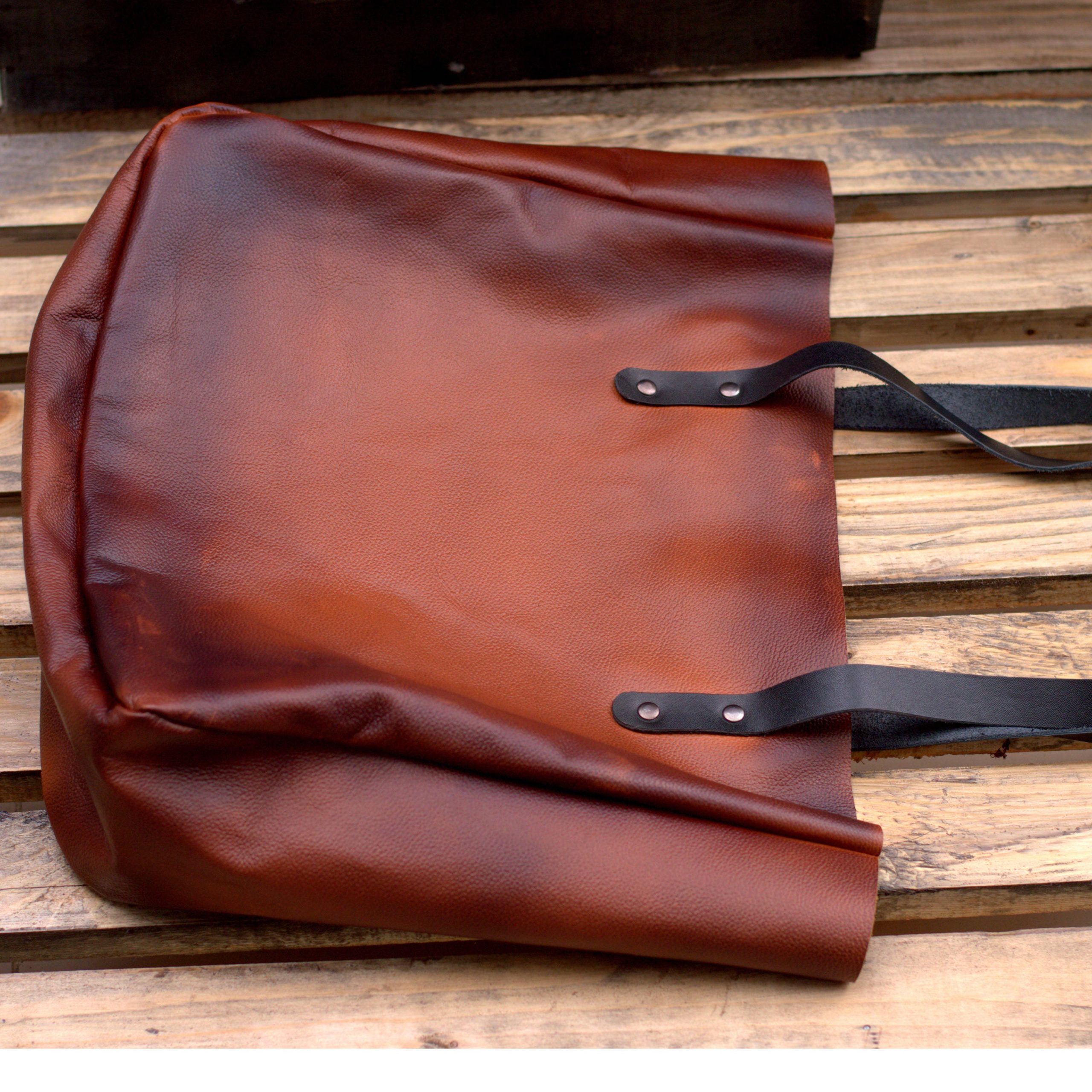 Crafted from premium full-grain leather, this tote bag blends warm amber tones with deep black accents for a bold, artisanal look. Its thick, durable material ages beautifully, developing a unique patina that adds rugged character—perfect for long-term, everyday use.
