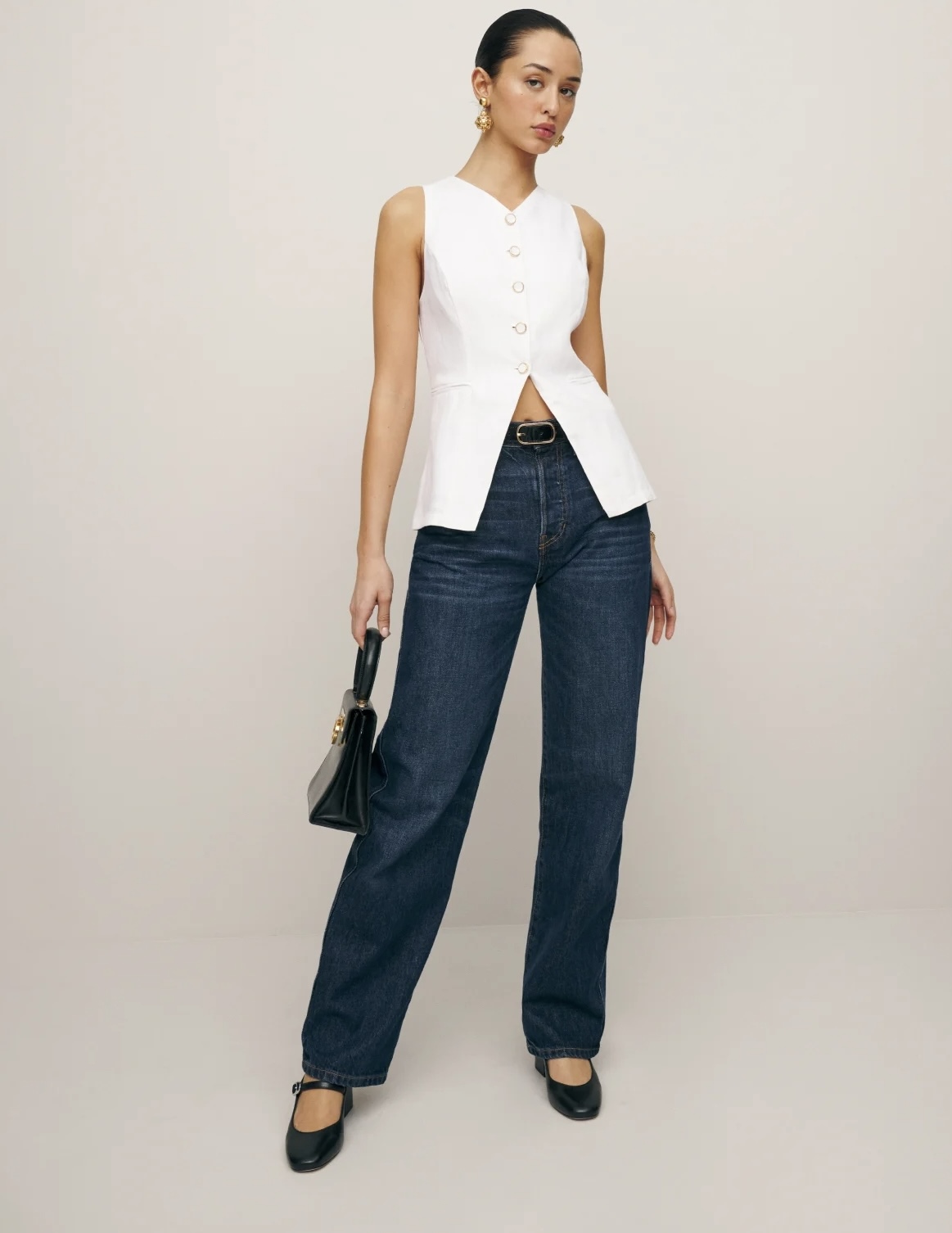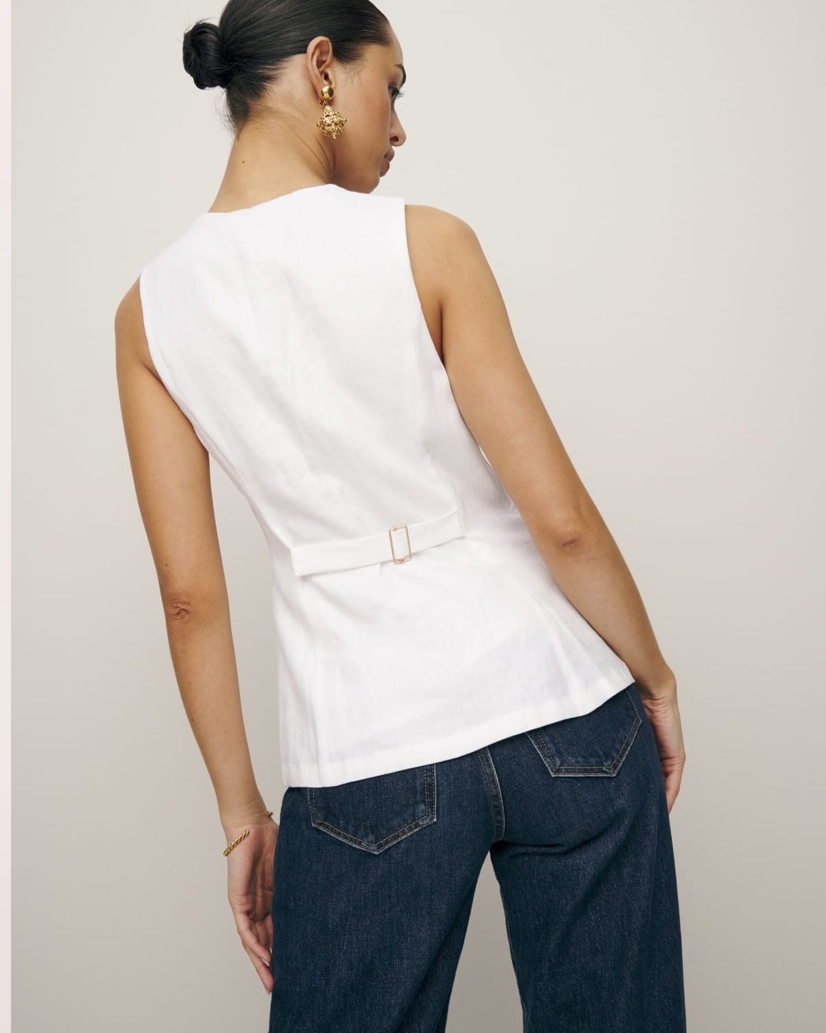 This white waistcoat is a refined fusion of classic tailoring and modern detailing. Crafted from a breathable linen-blend fabric, it features a V-neckline, a row of gold-tone circular buttons down the front, and a back belt that allows for a customizable, waist-defining fit. The sleeveless design and structured seaming create a polished silhouette, making it a versatile piece that seamlessly transitions between casual and semi-formal occasions.