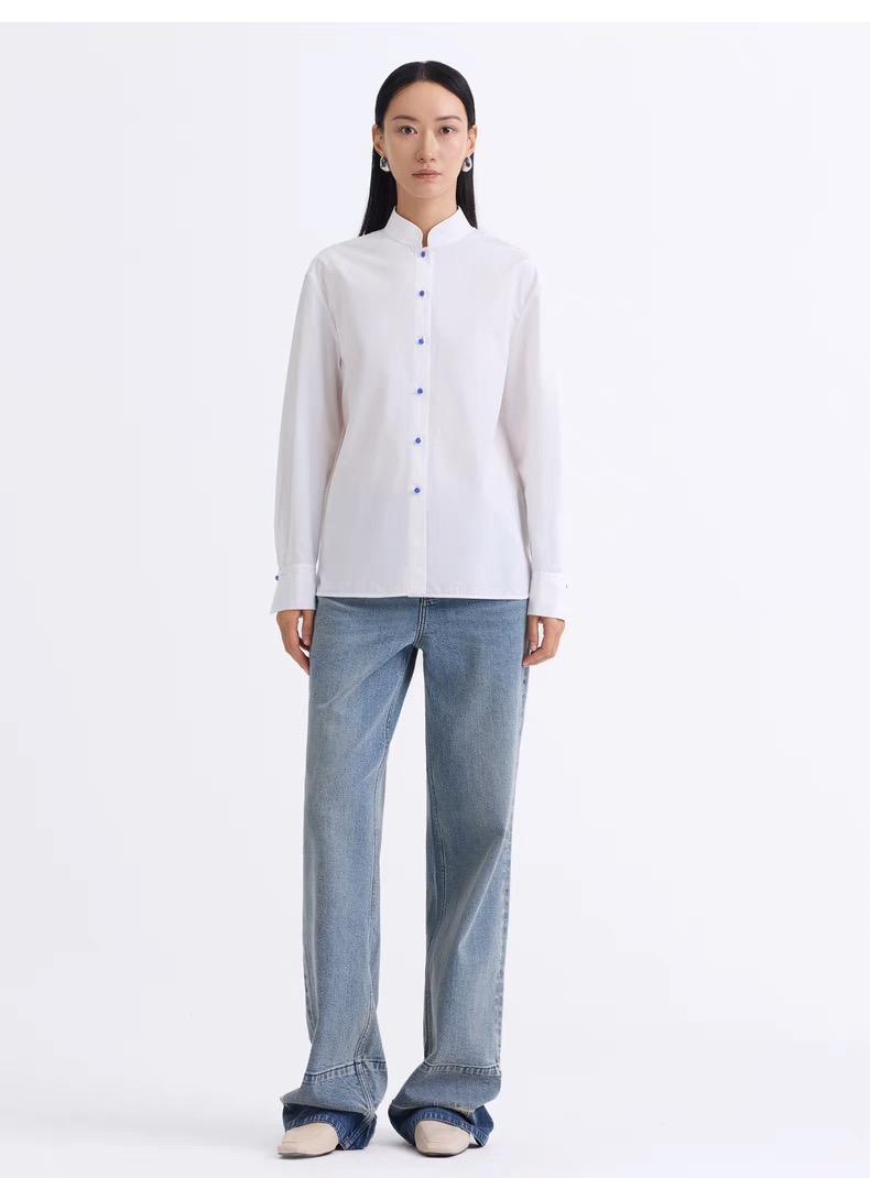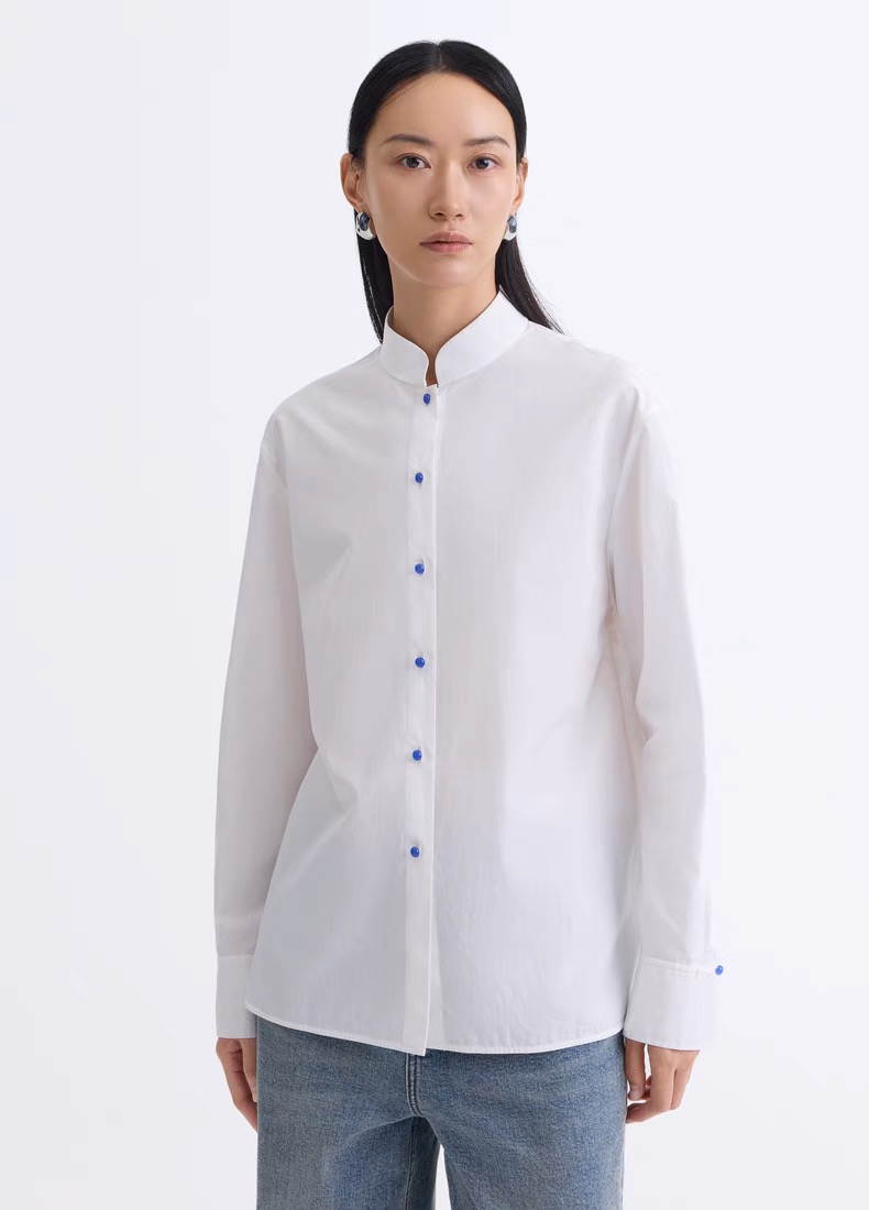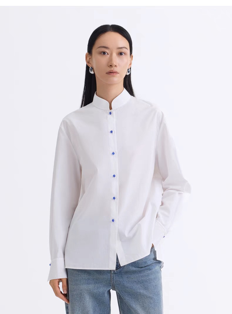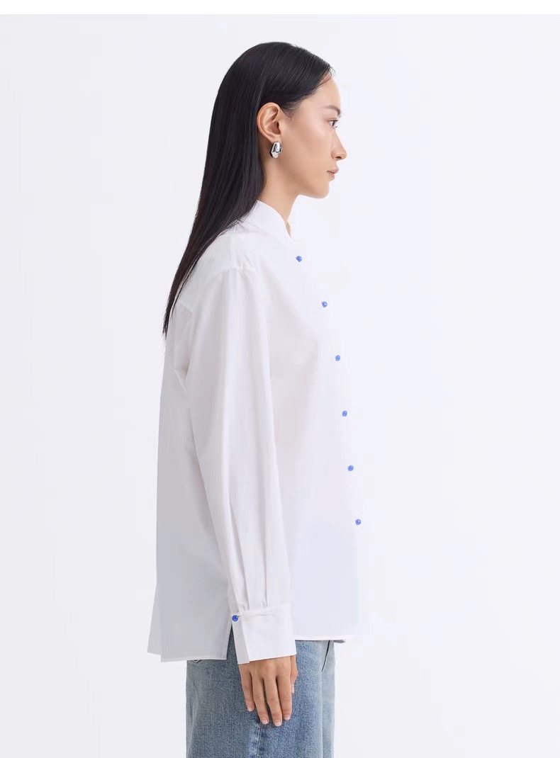 Its adaptability makes it a wardrobe staple. Pair it with light-wash jeans and sneakers for a relaxed, everyday look, or tuck it into tailored trousers and finish with heels for a polished office ensemble. Whether you’re attending a creative meeting or enjoying a weekend outing, this shirt’s mandarin collar and blue button details ensure you exude understated elegance, proving it’s an essential item for those who appreciate refined, detail-oriented fashion.