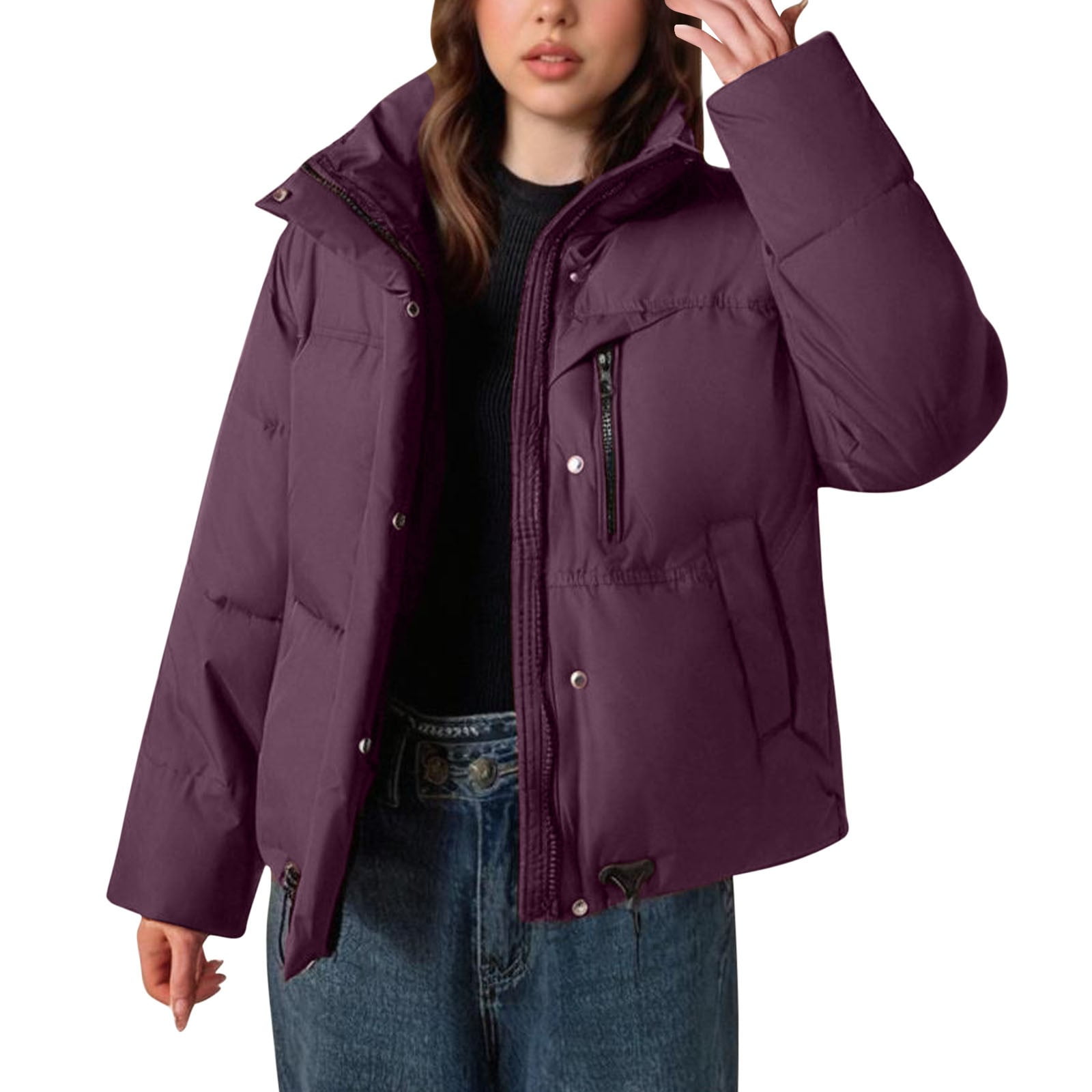Winter Jackets for Women Long Sleeve Full-Zip Down Coat Warm Winter Windproof Jacket Purple M