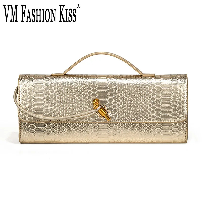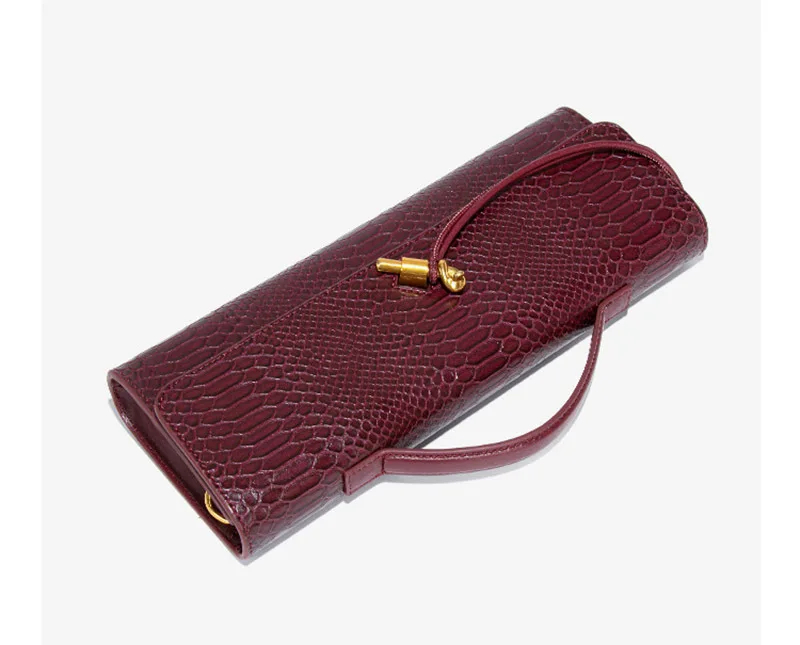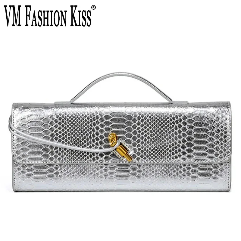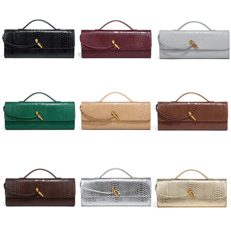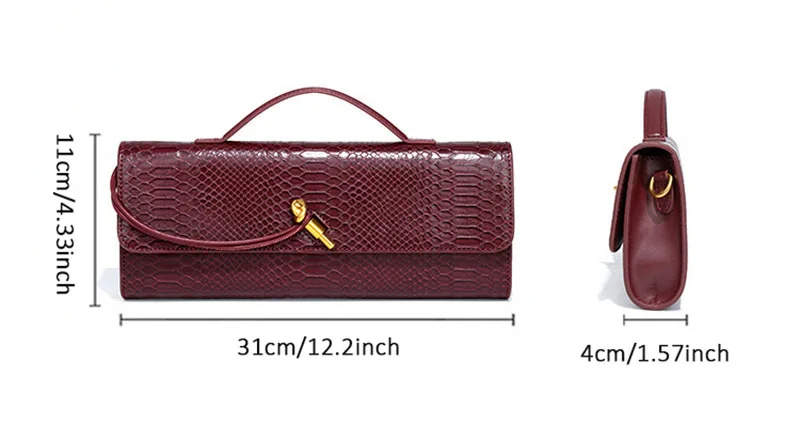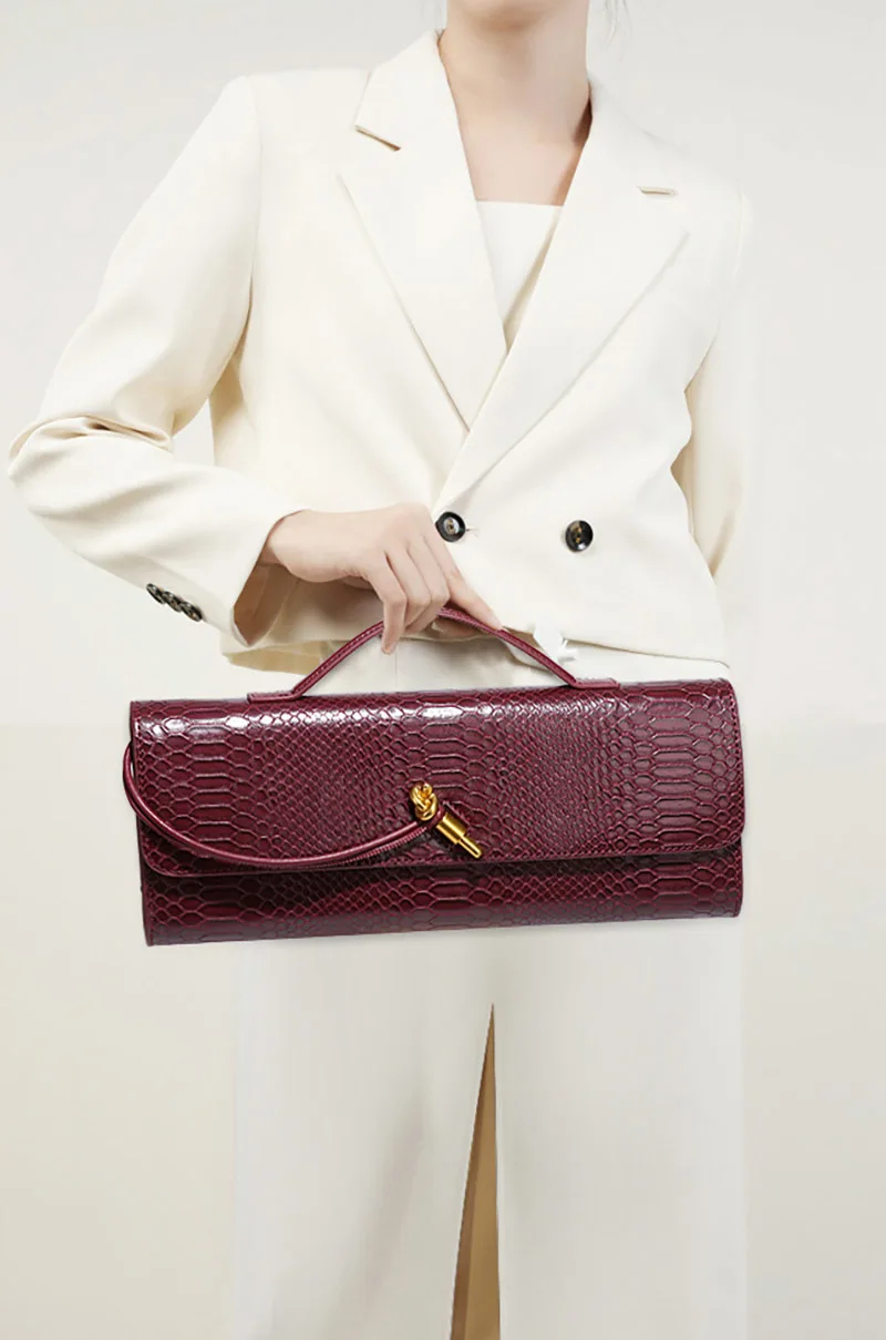 Description: This stylish bag is a versatile addition to your accessory collection. Made of luxurious snakeskin-patterned material, it ensures a refined aesthetic and longevity. The unique gold-tone hardware and dual-carry options add a fashionable element, while the clutch silhouette offers practical storage for essentials. Its formal design flatters any outfit, making it suitable for special events, evening wear, or upscale gatherings. Pair it with evening gowns, dresses, or suits for a chic look that adapts to various formal settings. Stay stylish and sophisticated with this trendy bag.