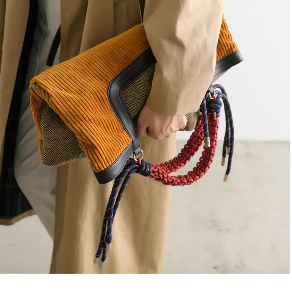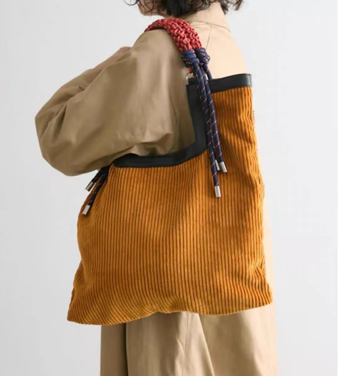 Description: This corduroy bag is a versatile addition to your accessory collection. Made of soft and textured corduroy fabric, it brings a unique style to your looks in any season. The braided color-block strap adds a trendy detail, and the spacious capacity ensures practicality. Its casual-chic silhouette makes it suitable for daily commutes, weekend outings, or shopping trips. Pair it with different outfits to elevate your style and stay fashionable with this trendy bag.