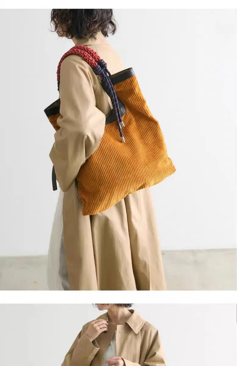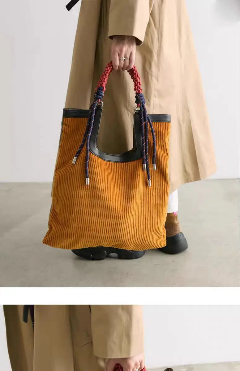 Women Bags Corduroy Fashion Vintage High-Capacity Tote Bags Weaving Handle Office Lady Girls Bag