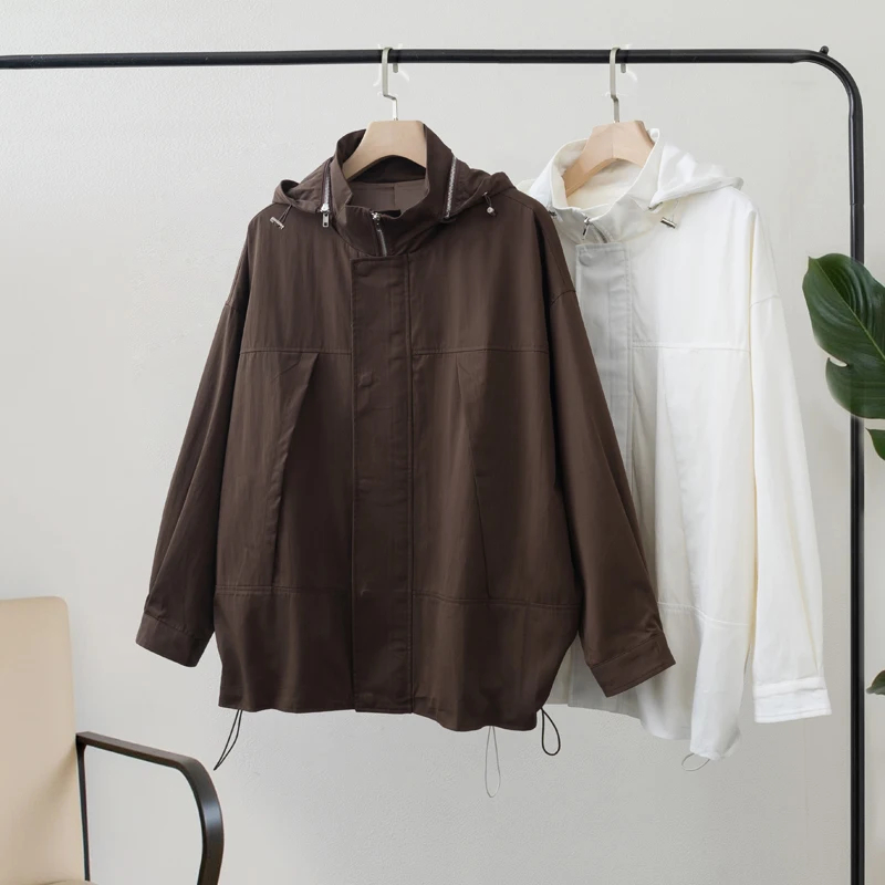 Waterproof & Durable: Made from high-quality waterproof fabric, this jacket provides excellent water resistance and durability, keeping you dry and comfortable in rainy or windy weather while maintaining a stylish look.Oversized & Hooded Design: Featuring a loose oversized cut and an integrated hood, this jacket adds a trendy, streetwear-inspired touch to your outfit while offering practical protection against the elements.Functional Drawstring Detail: Enhance your style with the adjustable drawstrings at the hem, allowing you to customize the fit and add a dynamic flair to the design. These details not only elevate the look but also provide functional adjustability.Relaxed Silhouette: Designed in an oversized fit, this women’s long-sleeved solid jacket offers a relaxed and laid-back look, effortlessly creating a cool and edgy appearance for a confident fashion statement.Versatile Styling: Perfect for various occasions, this jacket pairs seamlessly with leggings, shorts, or dresses for both casual and fashion-forward outings. Customize your look by accessorizing with different boots, bags, and jewelry to suit different settings, from daily commutes to street style shoots or weekend gatherings.