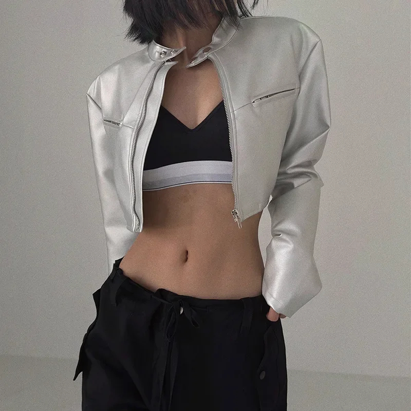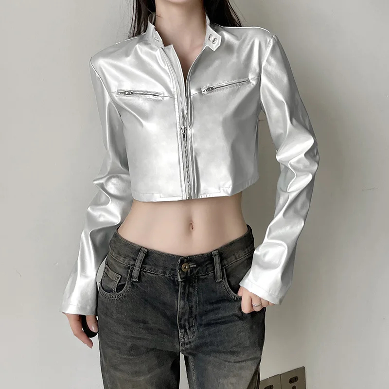 Chic Stand-Up Collar: Featuring a sleek stand-up collar and full-zip front, this jacket adds a trendy, polished edge to your outfit. The cropped length highlights your waistline, balancing edgy design with a figure-flattering fit.