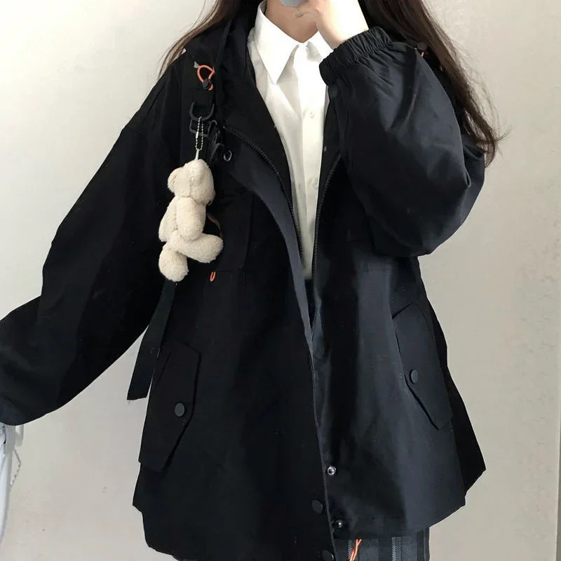 Women Solid Oversize Jacket Harajuku Korean Casual Loose Hooded Coats Spring Autumn Zip Preppy School Girls Vintage Streetwear