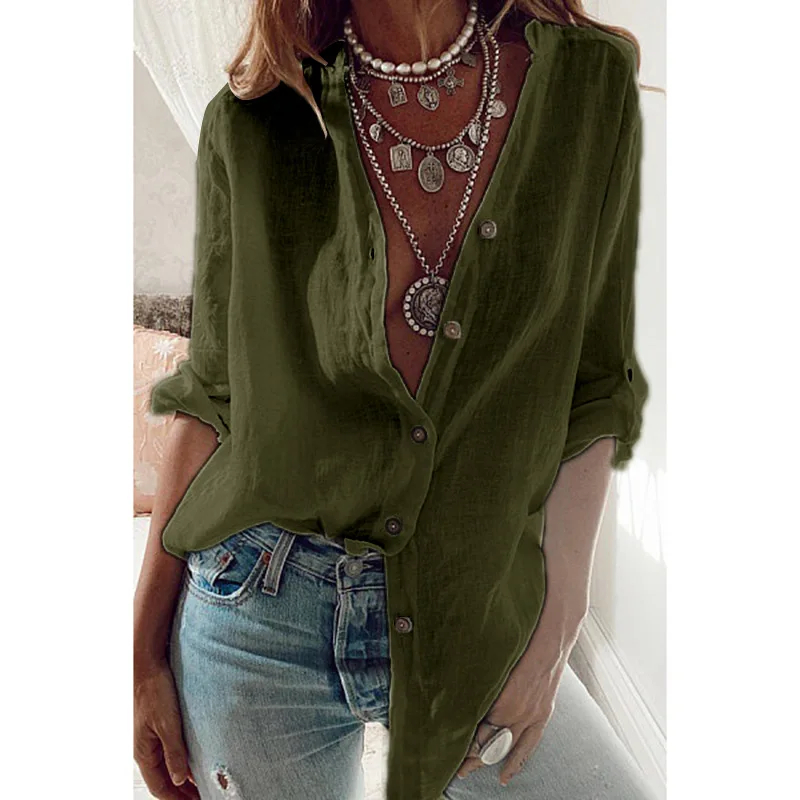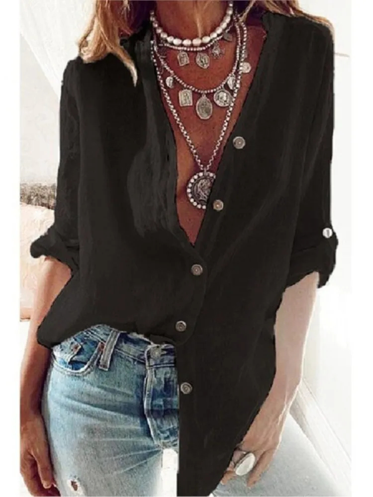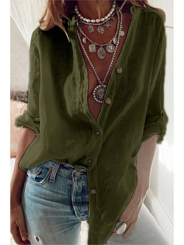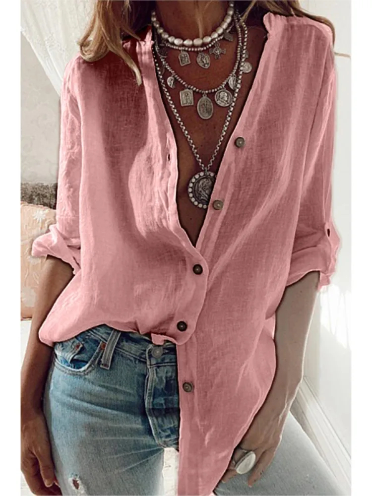 Women's Autumn New Solid Color Cotton Foldable Sleeves Loose Sexy V-neck Button Casual Comfortable Long Sleeve Top For Women