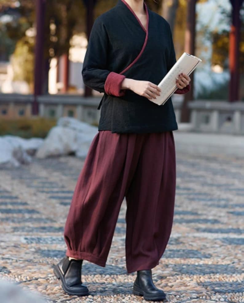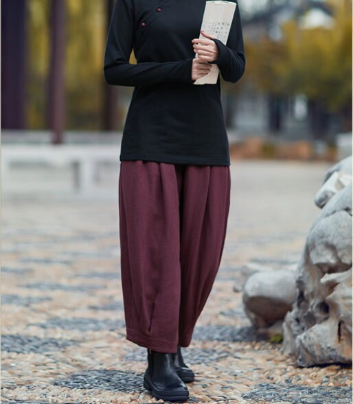 These lantern-leg flowing pants are a versatile staple for elegant wardrobes. Made from smooth, lightweight fabric, they offer all-day comfort and graceful movement for various occasions. The high elastic waist and tapered lantern silhouette create a flattering, timeless fit, while the side pockets add functional convenience. Perfect for cultural-inspired looks, outdoor strolls, or low-key meetups, these pants balance traditional charm with modern style. Pair them with your favorite tops and footwear to create looks that suit serene weekdays or leisurely weekends.