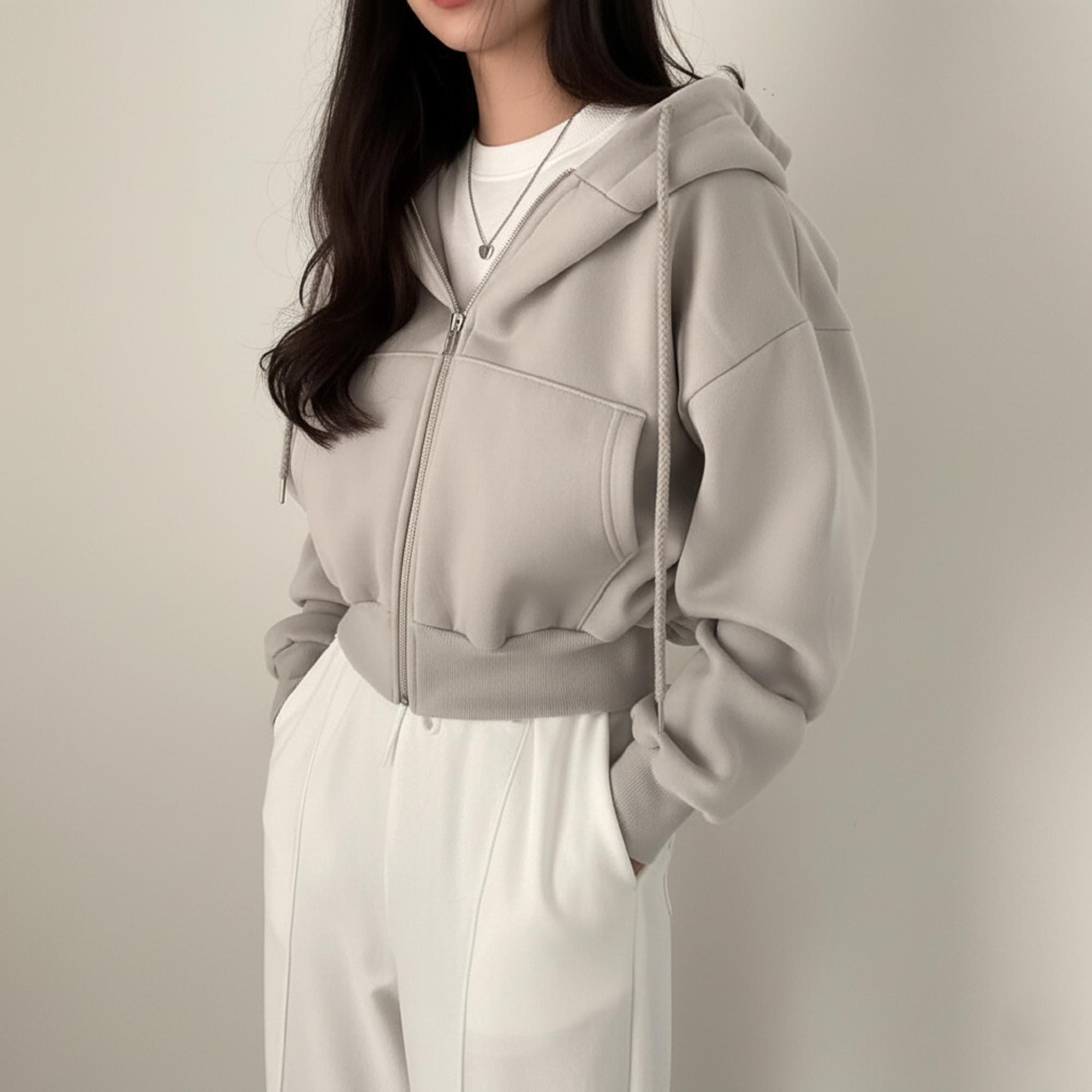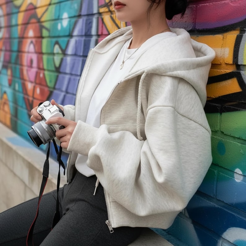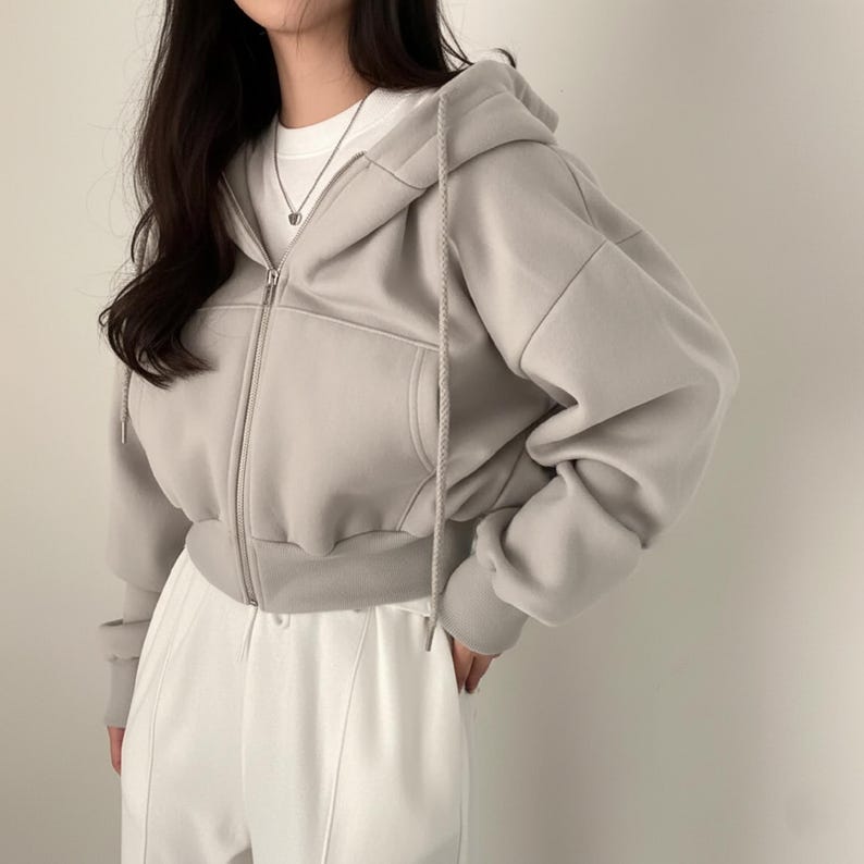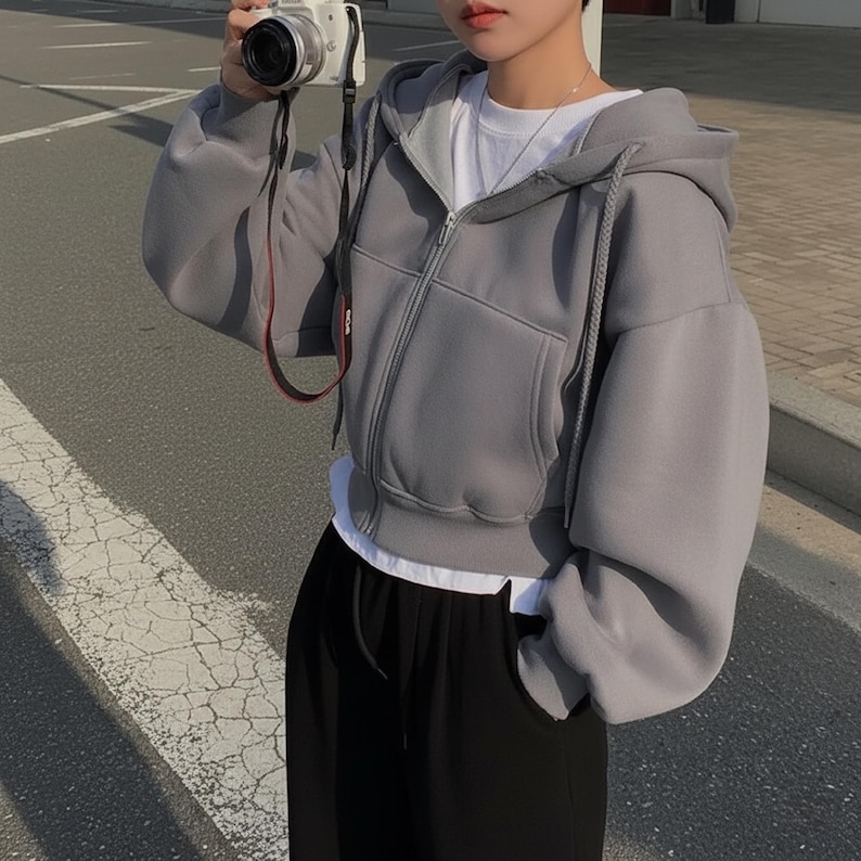 This cropped hoodie is a wardrobe staple that pairs with high-waisted jeans for a casual daily look, wide-leg pants for a polished relaxed outfit, or skirts layered with tights for a chic, modern vibe. Accessorize with sneakers, a crossbody bag, or delicate necklaces to tailor the look to errands, brunch dates, or casual hangouts.
