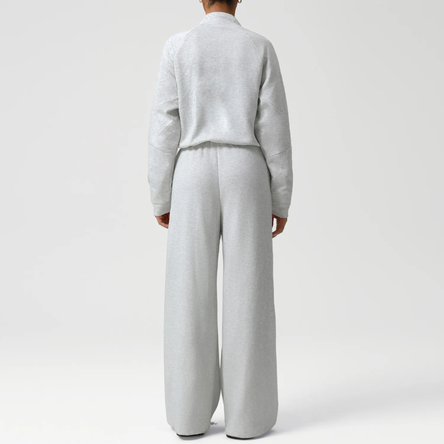 The matching pants include an elastic waistband with a functional drawstring, offering a personalized fit that stays secure during movement. The wide-leg cut drapes elegantly, blending casual ease with trendy, elongated lines.